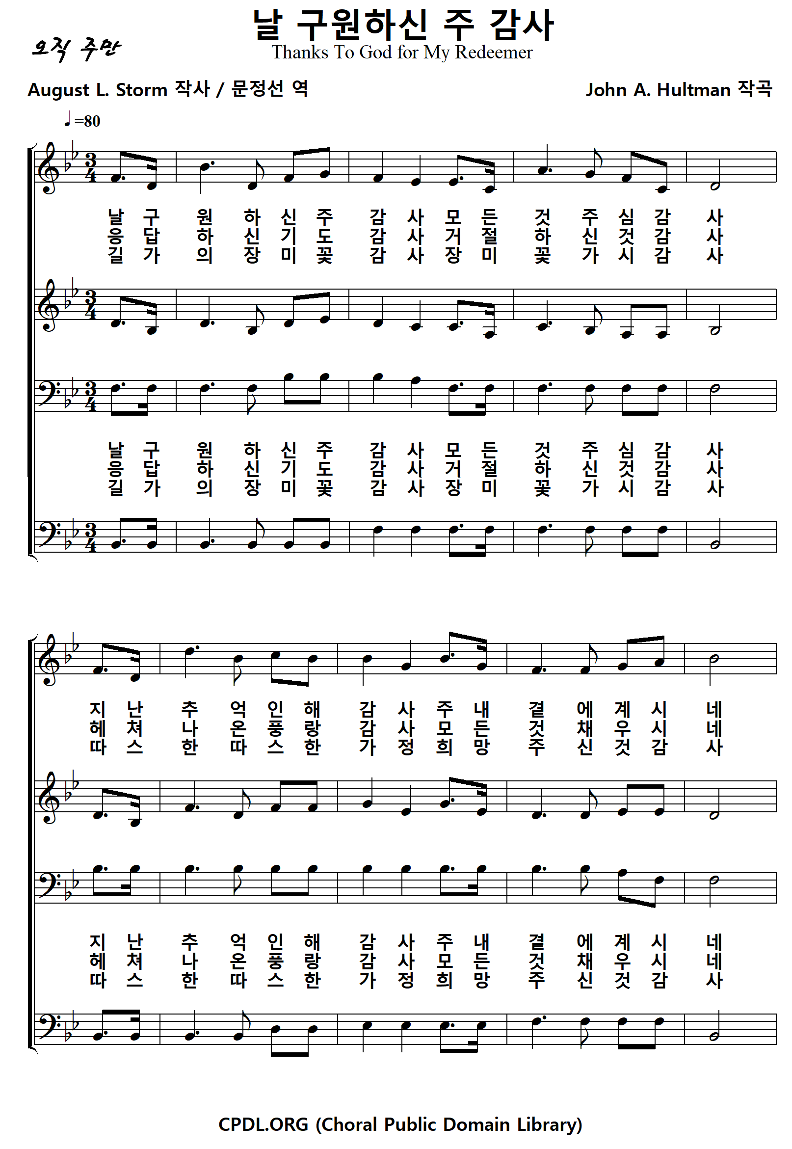 [찬양가사] 날구원하신주감사 / 감사찬송 [August L. Storm 작사, John A. Hultman 작곡, 문정선 역]