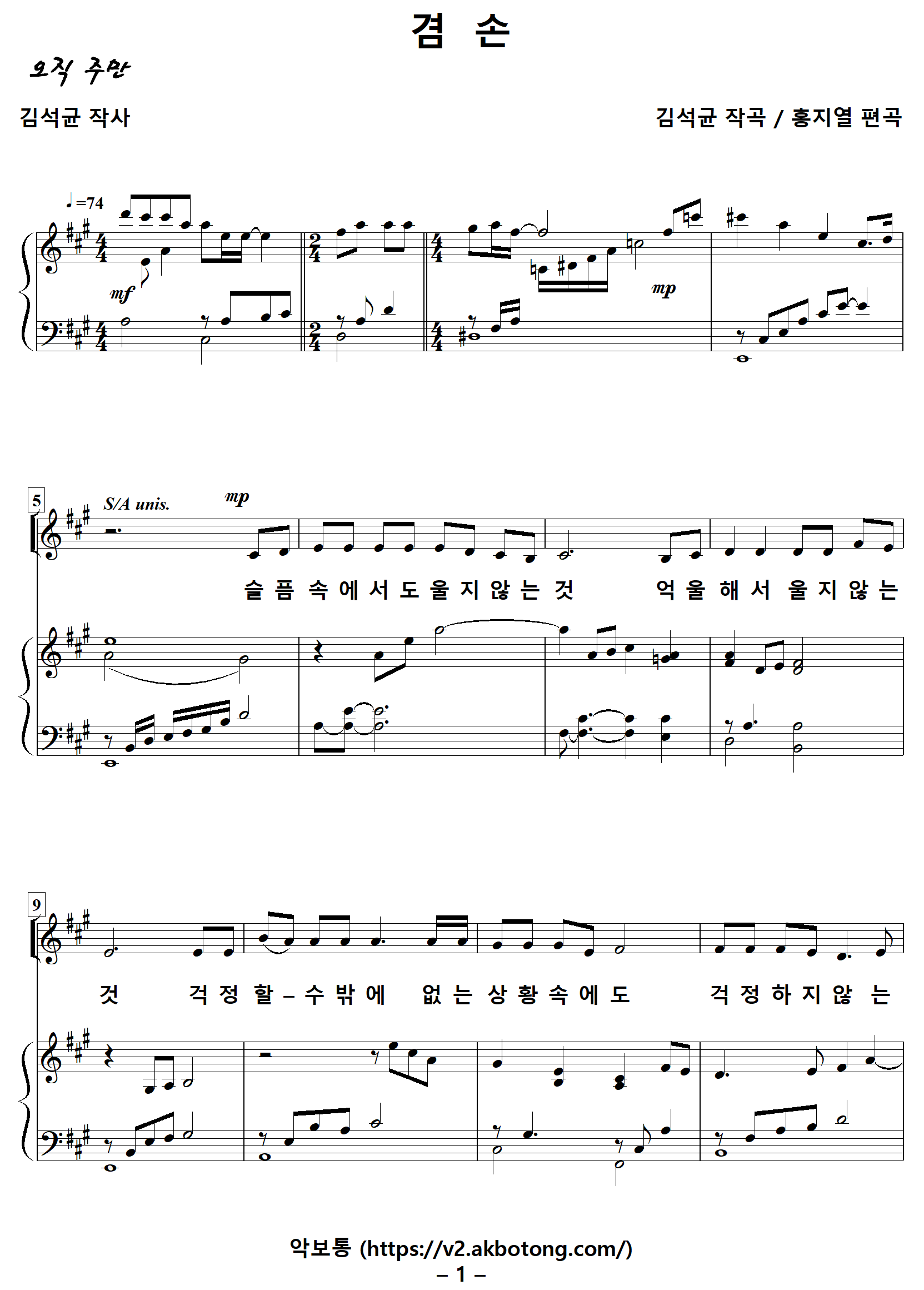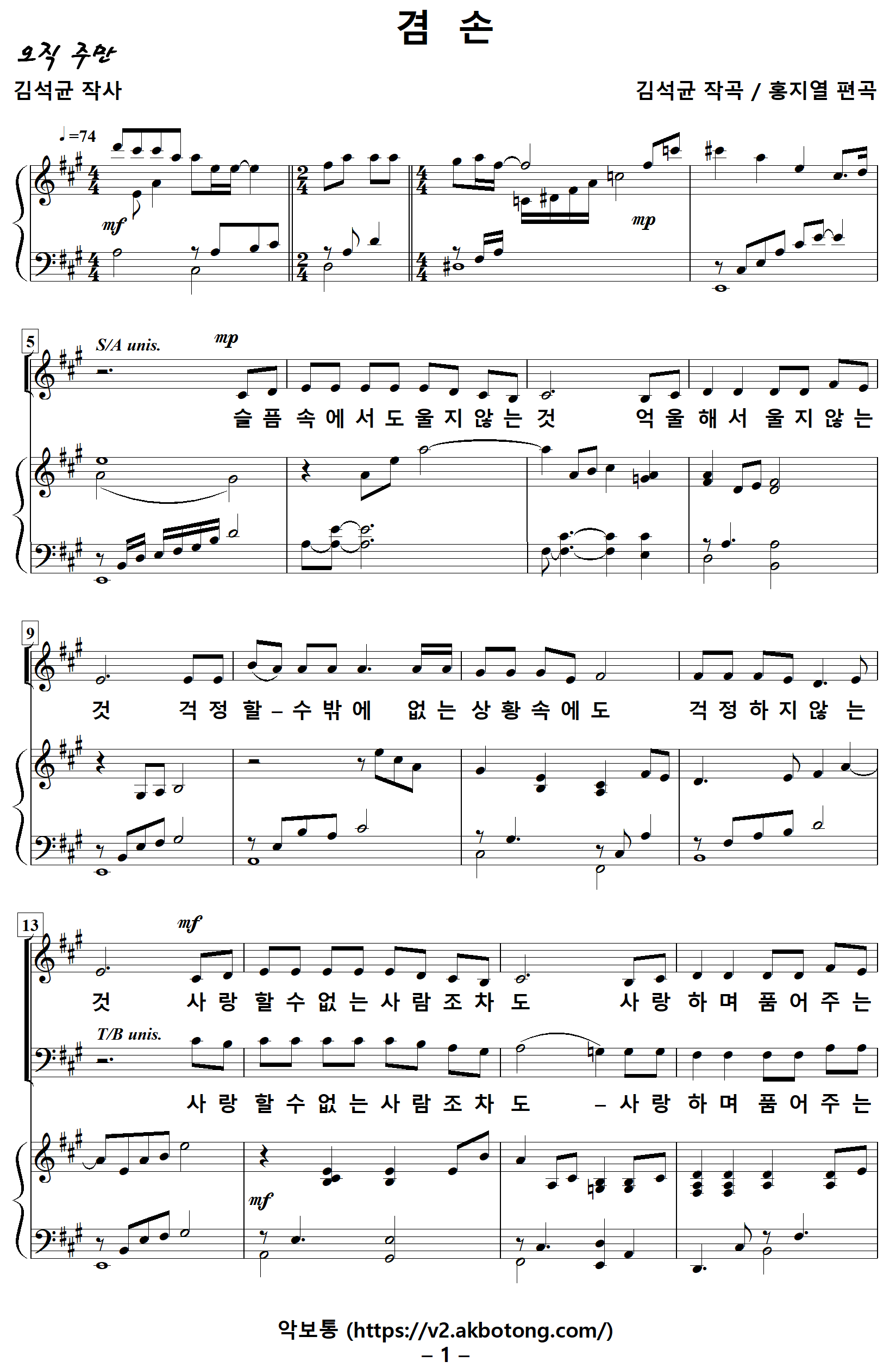 ** 홍지열 편곡의 겸손이란 곡명으로 악보통과 빛나라 출판사에서 출시 되어 있으나 편곡이 전혀 다른 곡입니다.