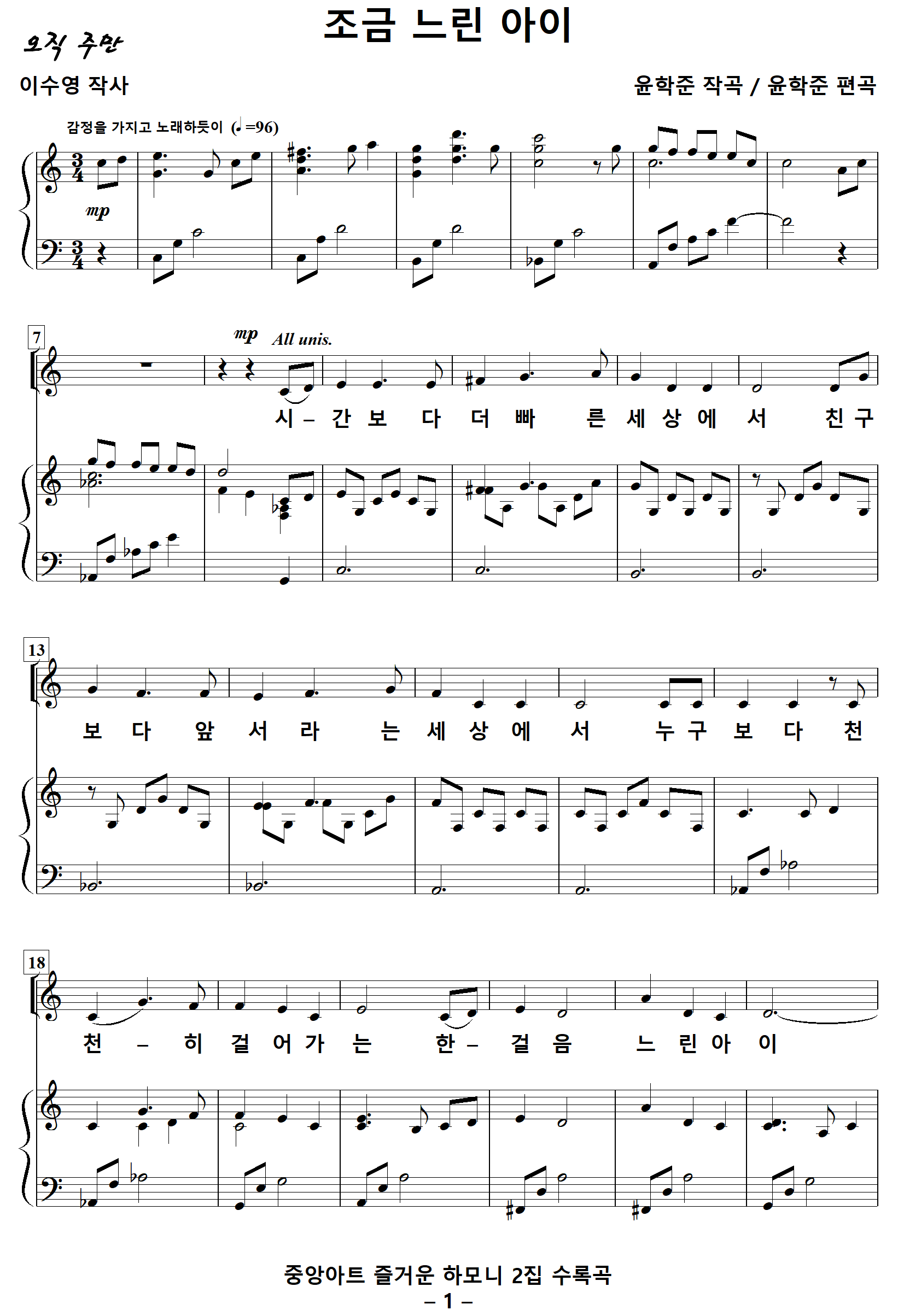 [동요가사] 조금느린아이 / 시간보다더빠른세상에서 [이수영 작사, 윤학준 작곡, 윤학준 편곡]