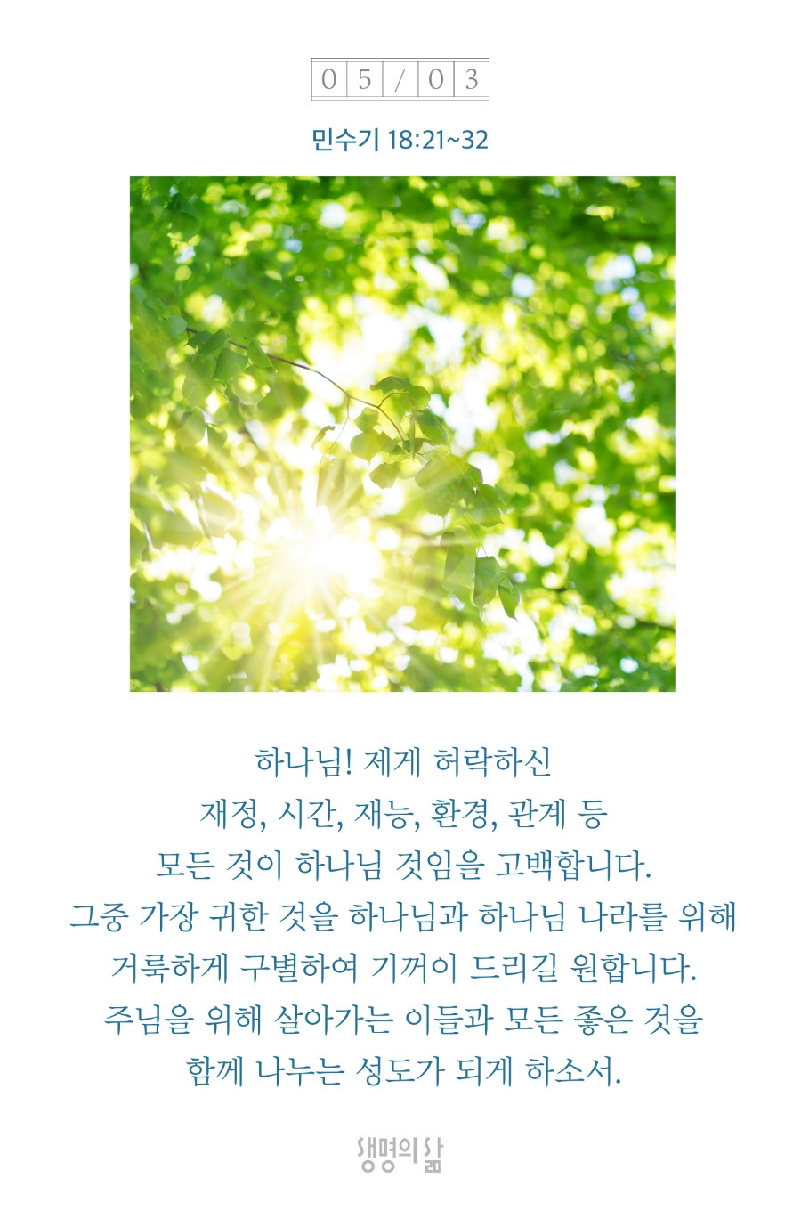 하나님! 제게 허락하신 재정, 시간, 재능, 환경, 관계 등 모든 것이 하나님 것임을 고백합니다. 그중 가장 귀한 것을 하나님과 하나님 나라를 위해 거룩하게 구별하여 기꺼이 드리길 원합니다. 주님을 위해 살아가는 이들과 모든 좋은 것을 함께 나누는 성도가 되게 하소서