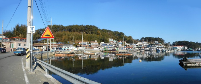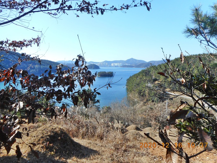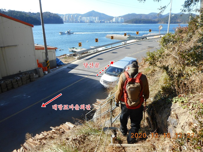 8분여 만에 대방포 마을로 내려서게 되고, 그 뒤로 마을 뒷산인 나지막한 물개산이 건너다 보이네요.