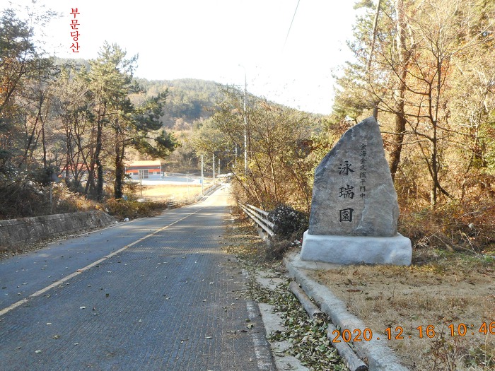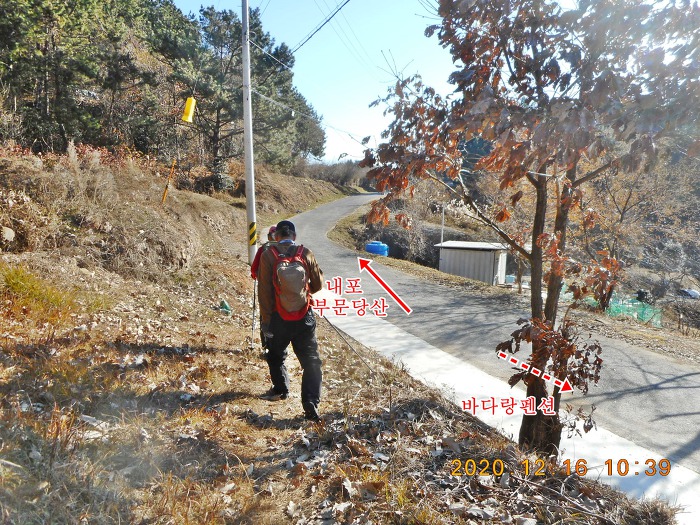 얼마 진행하지 않아 2차선 포장도로 끝 지점이자 부문당산 능선 끝자락에 이르며, 뜻밖에도
