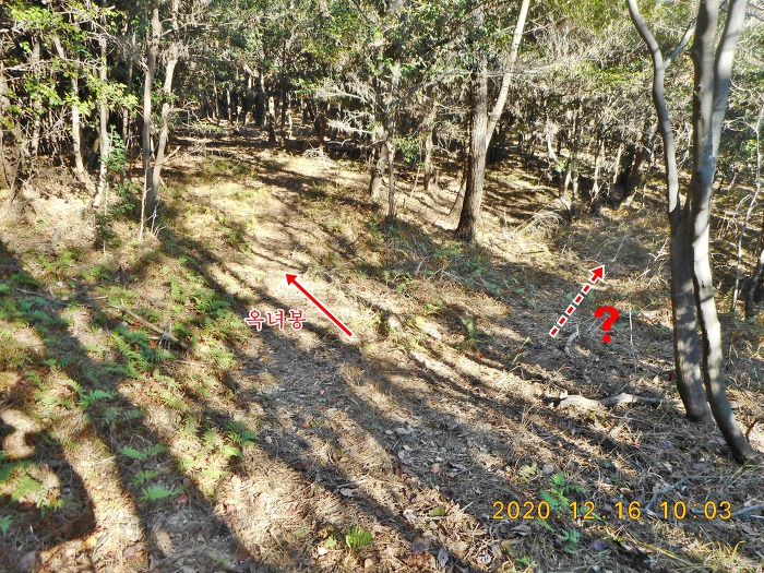 이어져 오는 능선과 합류하는 안부에 이르네요. 옥녀봉을 답사하고 뒤돌아 내려와서 좌측 능선으로