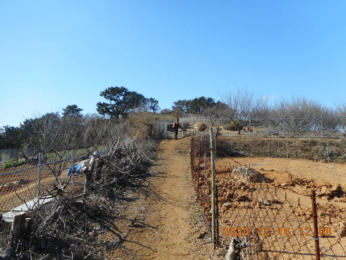 능선 안부 고개마루로 이어지는데, 능선 건너편으로는 경작지가 전개되며 철조망 펜스가 가로