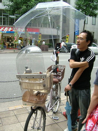 비오는 날에도 끄떡없는 자전거. 앞좌석 아이를 고려한 대형 스크린 윈드쉴드와 우산을 장착할 수 있는 소프트탑 레이서 모델이다. 비가 안오면 간단히 우산을 접어서 좌석 뒤의 대용량 트렁크에 수납할 수 있다.
