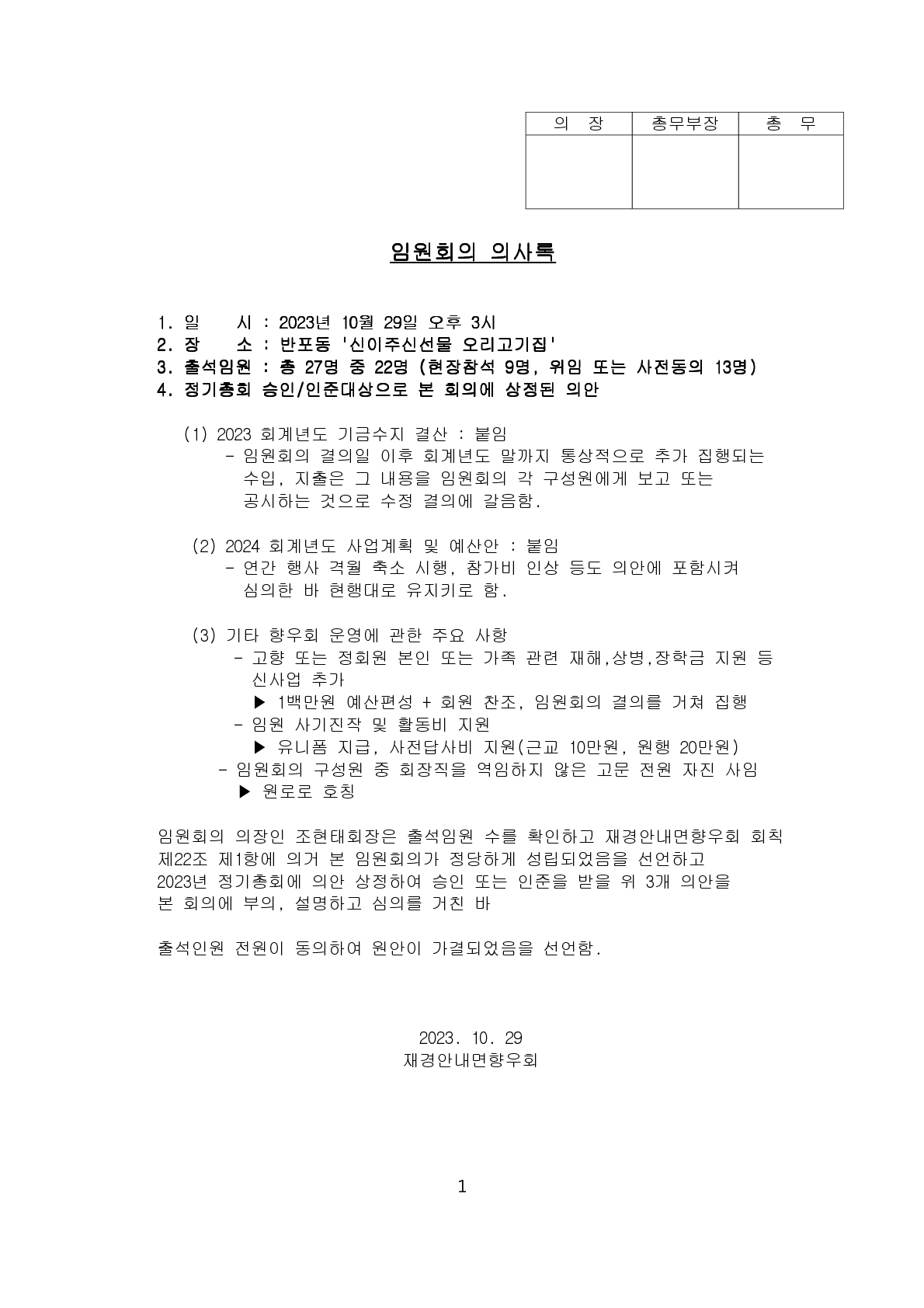 2023년 정기 임원회의 결과 보고 작성자조현태|작성시간23.10.30|조회수91 목록 댓글 1 글자크기 작게가 글자크기 크게가 2023.10.29 개최된 정기 임원회의 결과를아래와 같이 보고합니다. 1. 임원회의 내용 : 붙임 임원회의 의사록 참조2. 회의비용 : 붙임 지출증빙 참조 다음검색 현재 게시글 추가 기능 열기 북마크 공유하기 신고 센터로 신고 댓글 댓글 1 댓글쓰기 답글쓰기 댓글 리스트 작성자이태화47 | 작성시간 23.10.31 임원회의 참석사진입니다 이미지 확대 댓글 전체보기