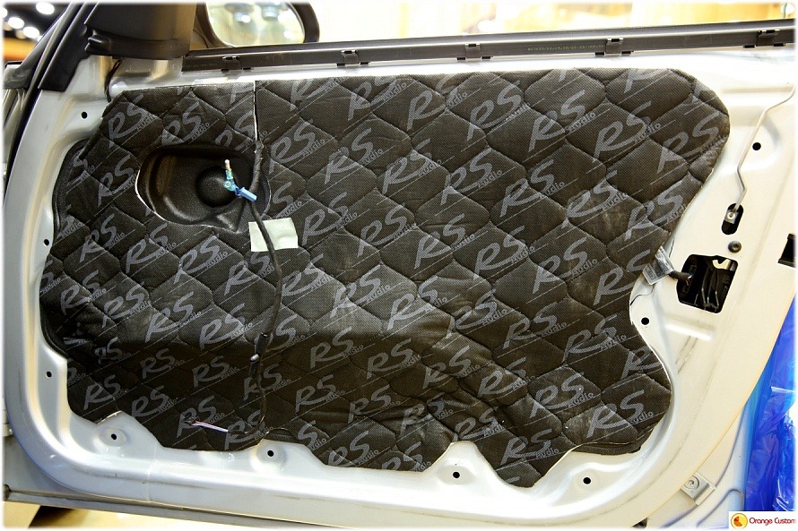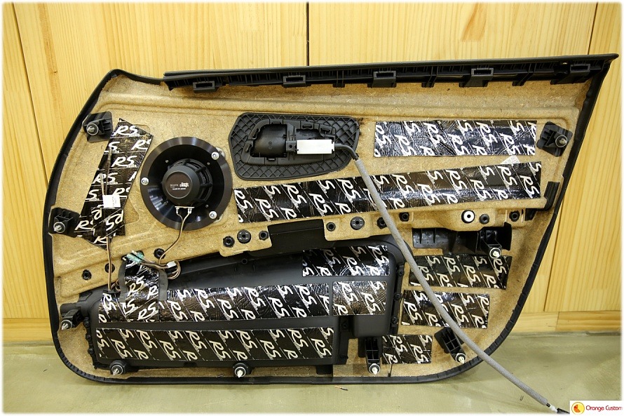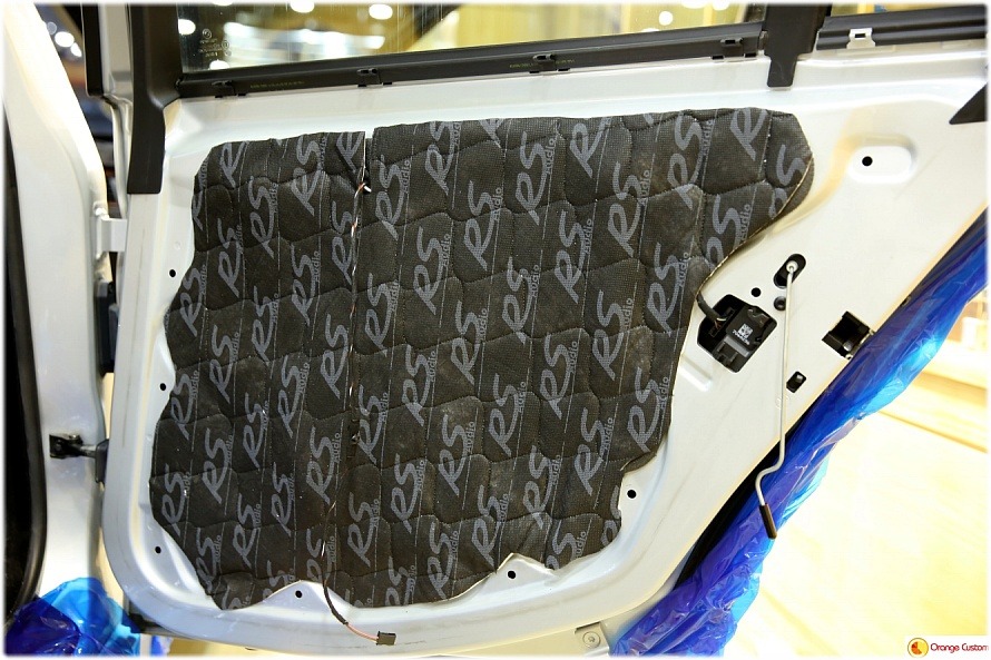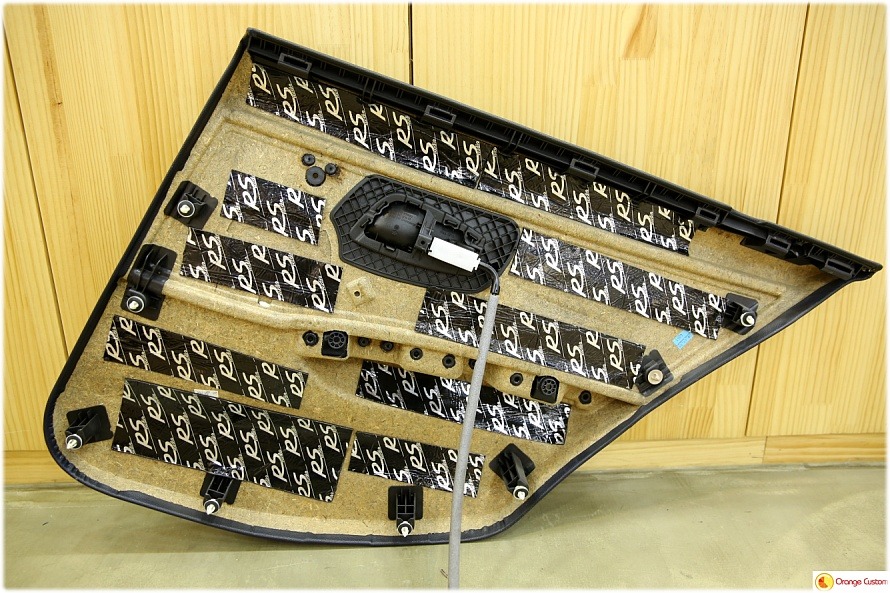 조립에 리스크가 없도록 도어 모양에 맞춰 재단한 RS신슐레이터를 깔끔하게 발라주면 방음작업은 완료입니다.