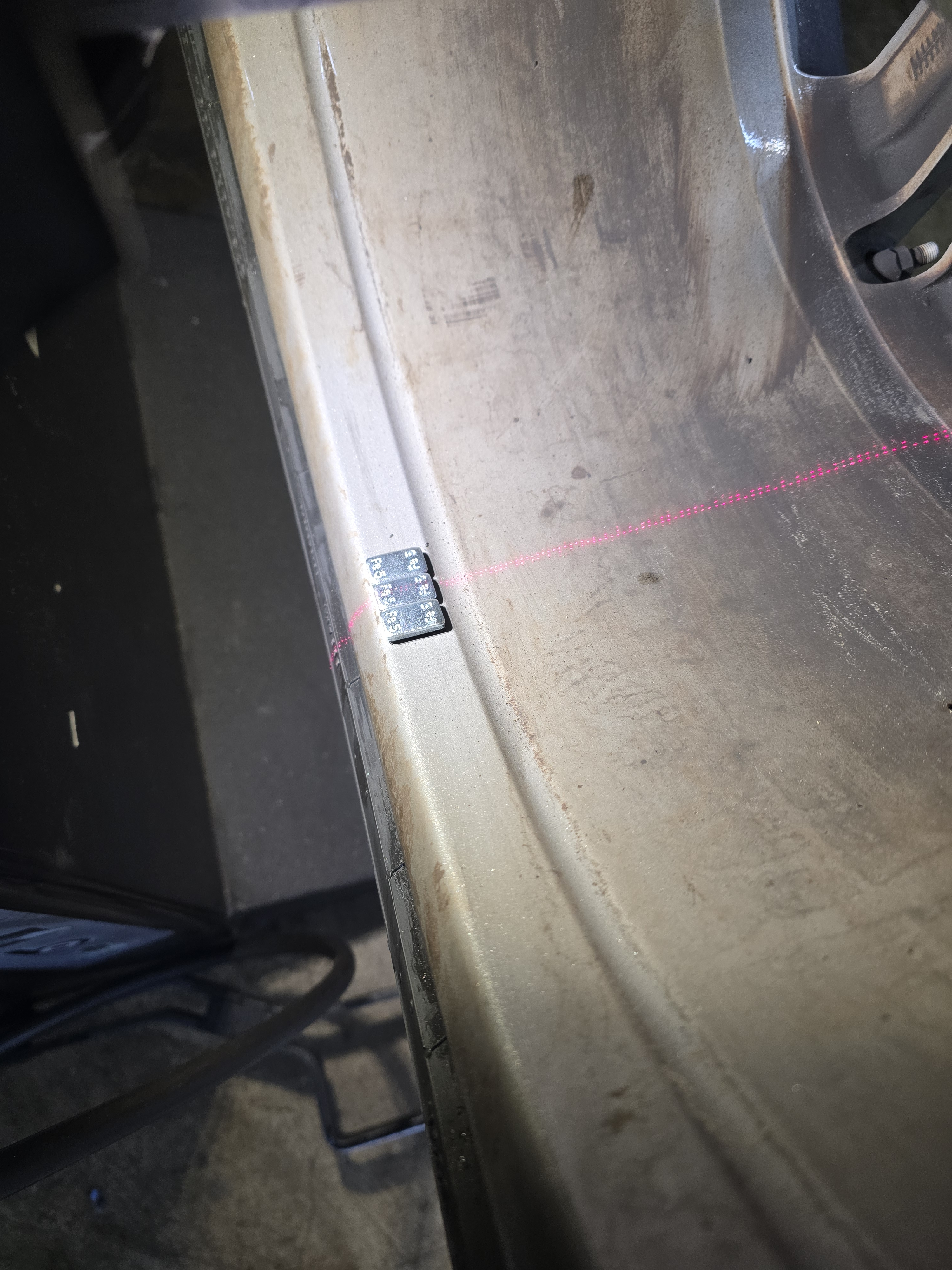 휠 밸런스를 측정해보니 내측 15 외측 20 그램의 웨이트를 부착하라고 나오는군요. 밸런서의 레이저가 알려주는 위치에 철재질의 웨이트를 부착한 후 재측정 해보니 기분좋은 OKOK 사인이 나오네요.