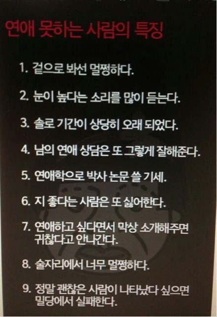 연애 못하는 사람의 특징 작성자KynoA|작성시간13.07.14|조회수1,260 목록 댓글 5 글자크기 작게가 글자크기 크게가 ^^ 다음검색 현재 게시글 추가 기능 열기 북마크 신고 센터로 신고 댓글 댓글 5 댓글쓰기 답글쓰기 댓글 리스트 작성자찬란한광휘 | 작성시간 13.07.14 공감이 몇 개 안감 작성자hjir | 작성시간 13.07.14 운영자님이 올리신거예요?ㅋㅋ신기하다 작성자KynoA 작성자 본인 여부 작성자 | 작성시간 13.07.14 페북에 올라왔길래 그냥 퍼와봤어요^^ 작성자황신영 | 작성시간 13.07.14 맞네 작성자둥기 | 작성시간 13.07.14 거의 나네.. 댓글 전체보기