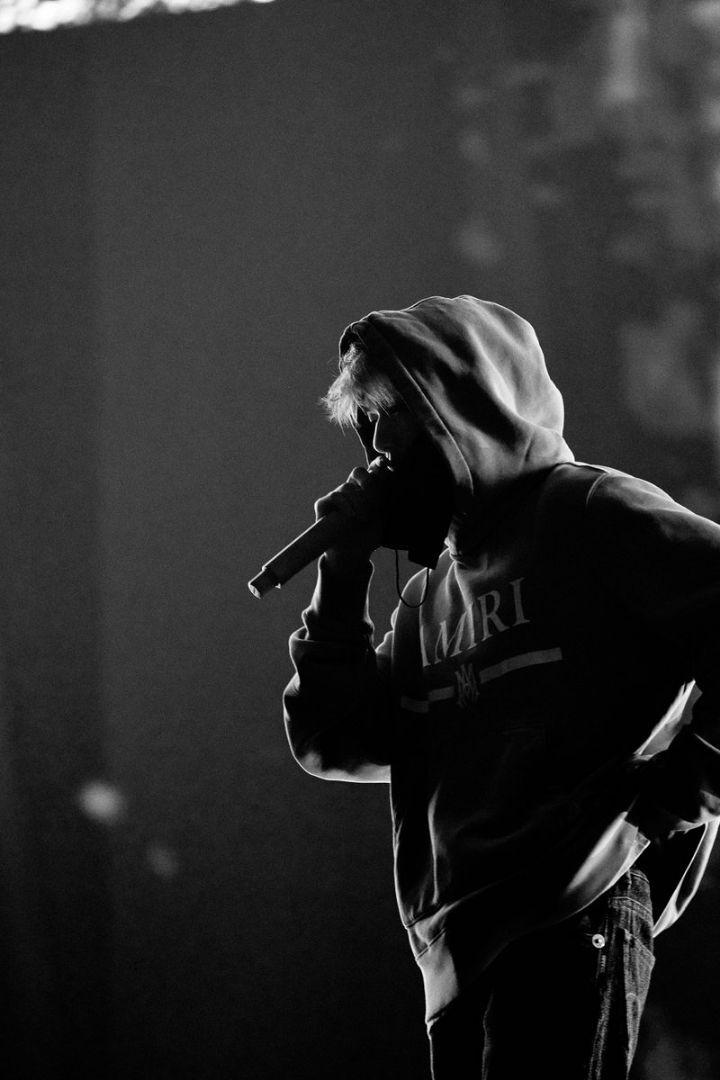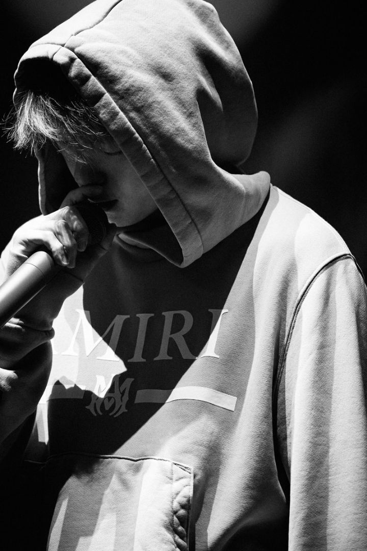 ๋จธ๋ฆฌ๊น์ง ๊น๊ฒ ๋๋ฌ์ด ํ๋ ์ฌ์ด๋ก ๊ทธ๊ฐ ๋ ๋งํ๋ ์ฝ์ํธ์ ๋ก๋ง๊ณผ๋ ๊ฐ์๋ ํธ๋ ๋ง์ดํฌ๋ฅผ ๋ค๊ณ ์ ์๋