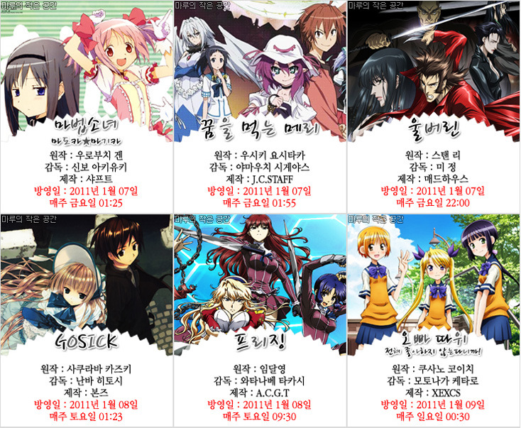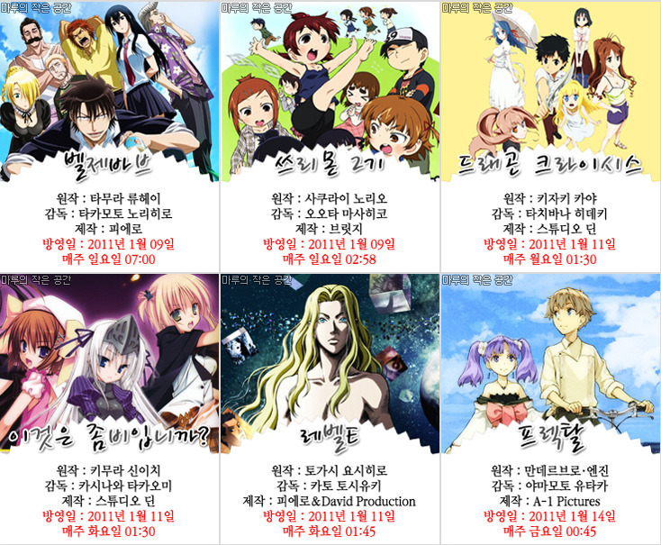 2011년 1월 신작애니 목록(자막제작자 및 요일방영표 정리)