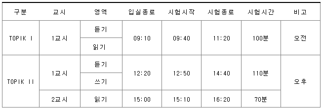- 시험 수준별(TOPIK Ⅰ, Ⅱ) 지원인원이 10명 미만인 경우 시험 시행하지 않음