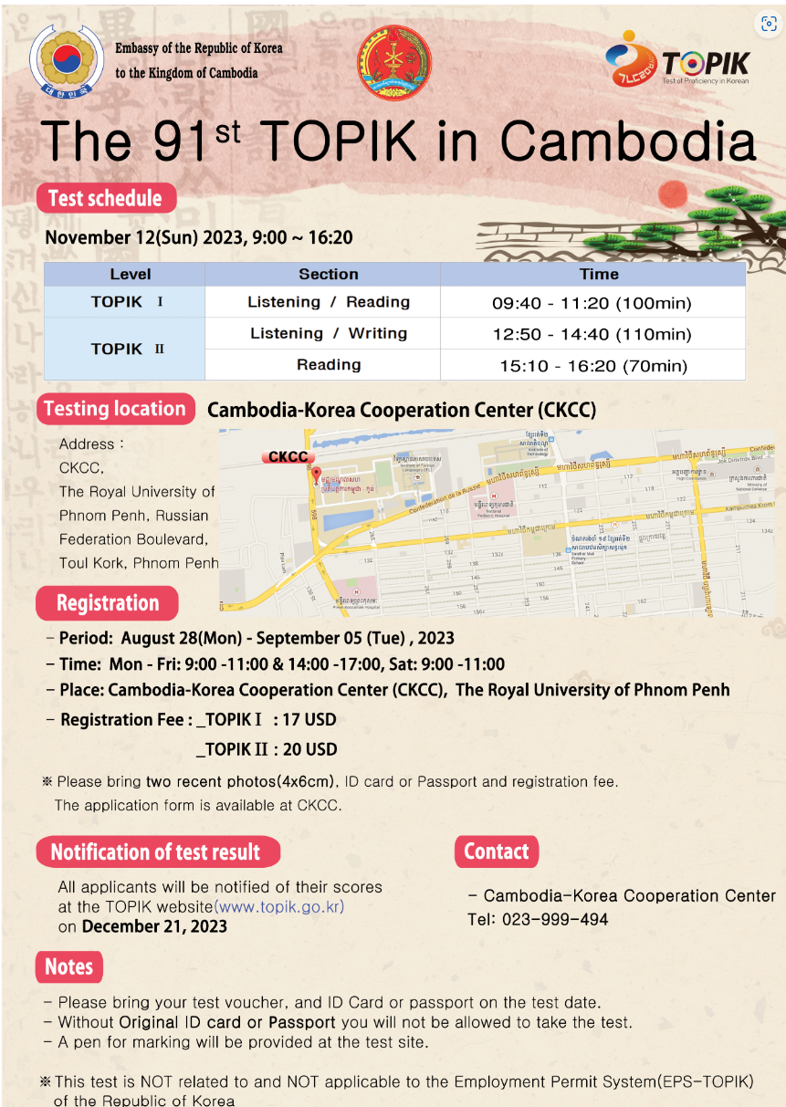 ◦ 시험 장소: Cambodia-Korea Cooperation Center(CKCC)