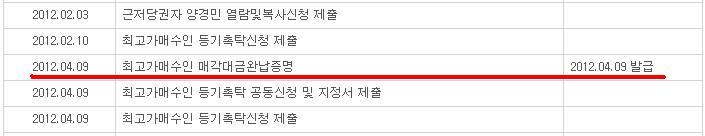 한 달 후인 2012년4월9일에서야 잔금을 납부 하였습니다.