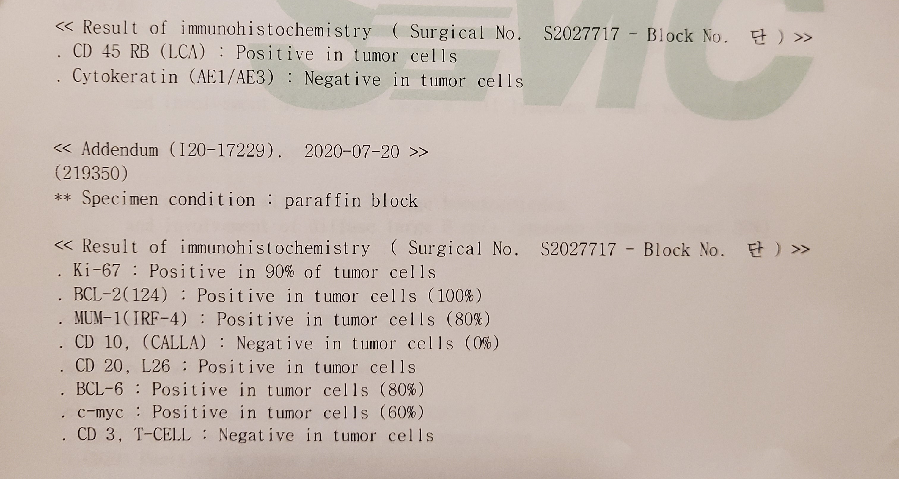 외래끝나고나오는 길에 조직검사지 사본받고와서 읽고있는데 그동안 공부한거에 비추어봤을때 매우 안좋은 상태인거같아 심란해지네요...double expressor 발현상태이고 모든 암표적마커가 포지티브인상태... 더블힛인지는 아직 피시결과가 안나왔나봐요...