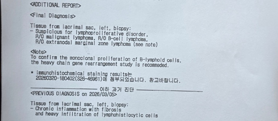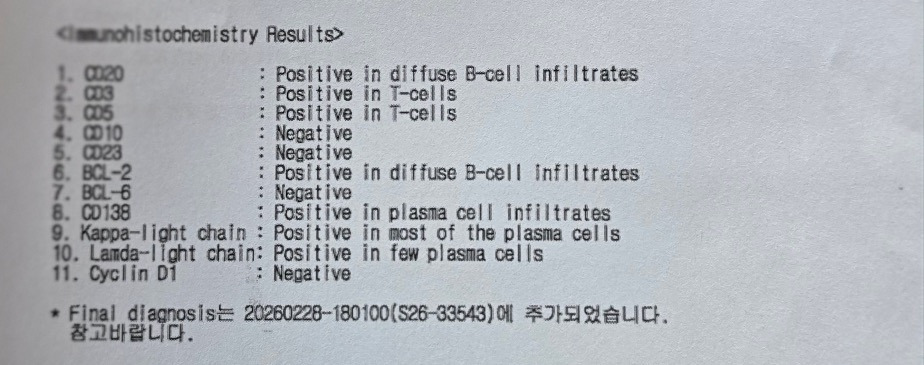 2. 조직검사 결과에 CD20과 BCL-2 항목에 diffuse b-cell infiltrates라는 문구가 있는데도 EMZL(변연부 림프종)으로 판단한 것으로 보여지는데요. 혹시나 미만성 거대 B-cell 림프종으로 최종 판단될 수 있는 건지도 궁금합니다.