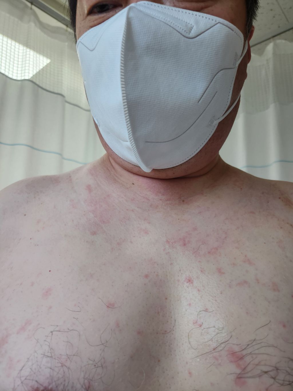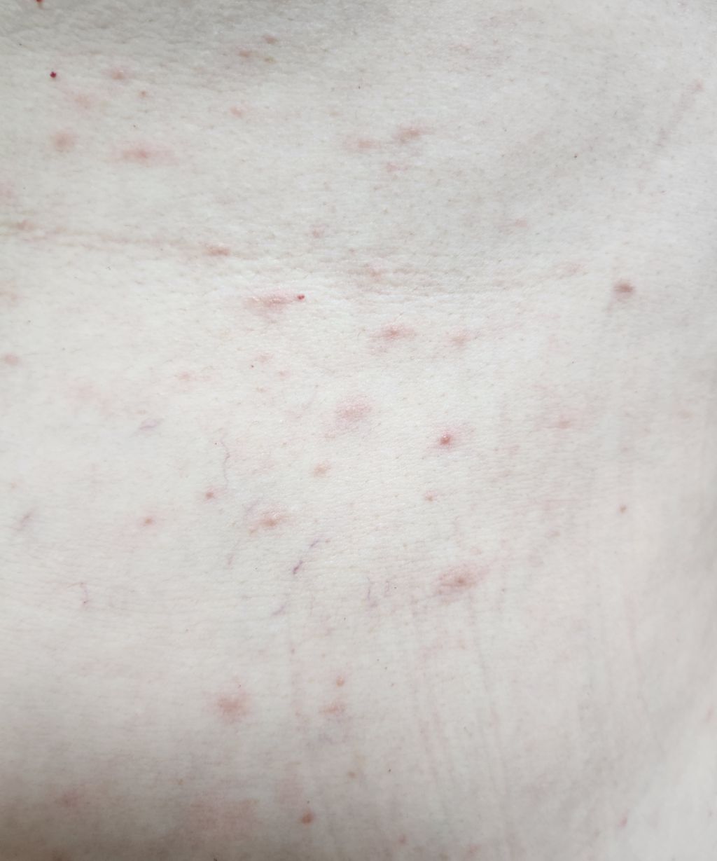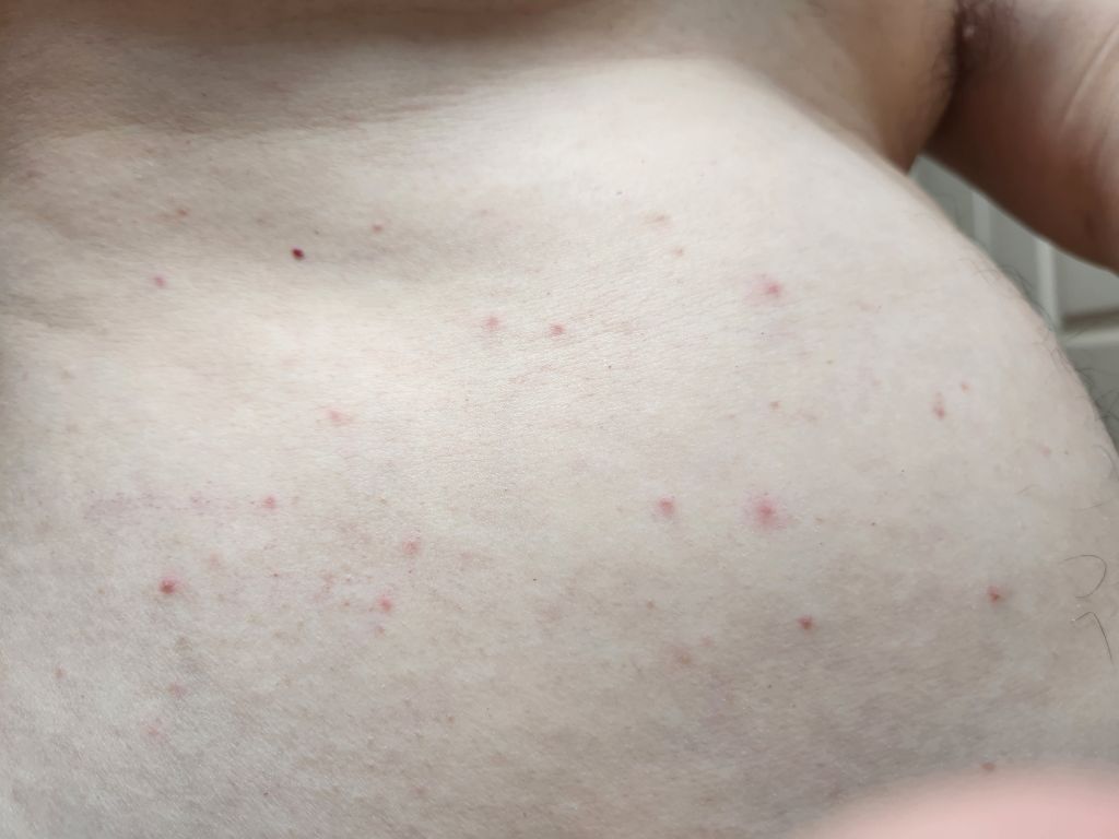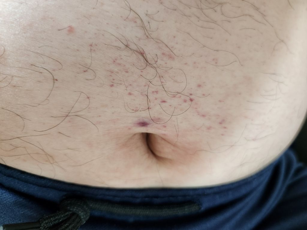 첨에는 작은 발진들이 생기다가 점점 퍼지더니 .... 지금은 배 부분 등 전체적으로는