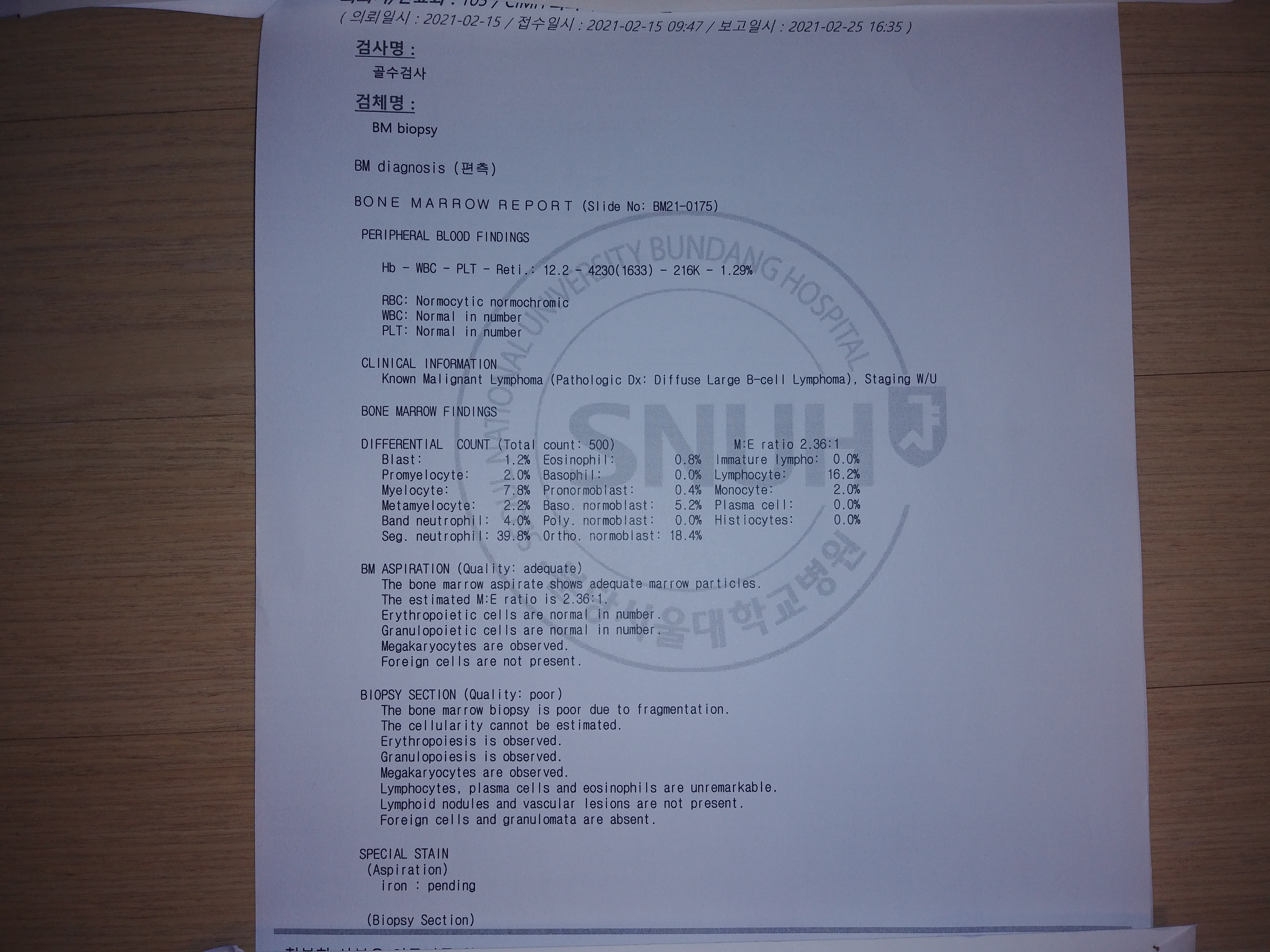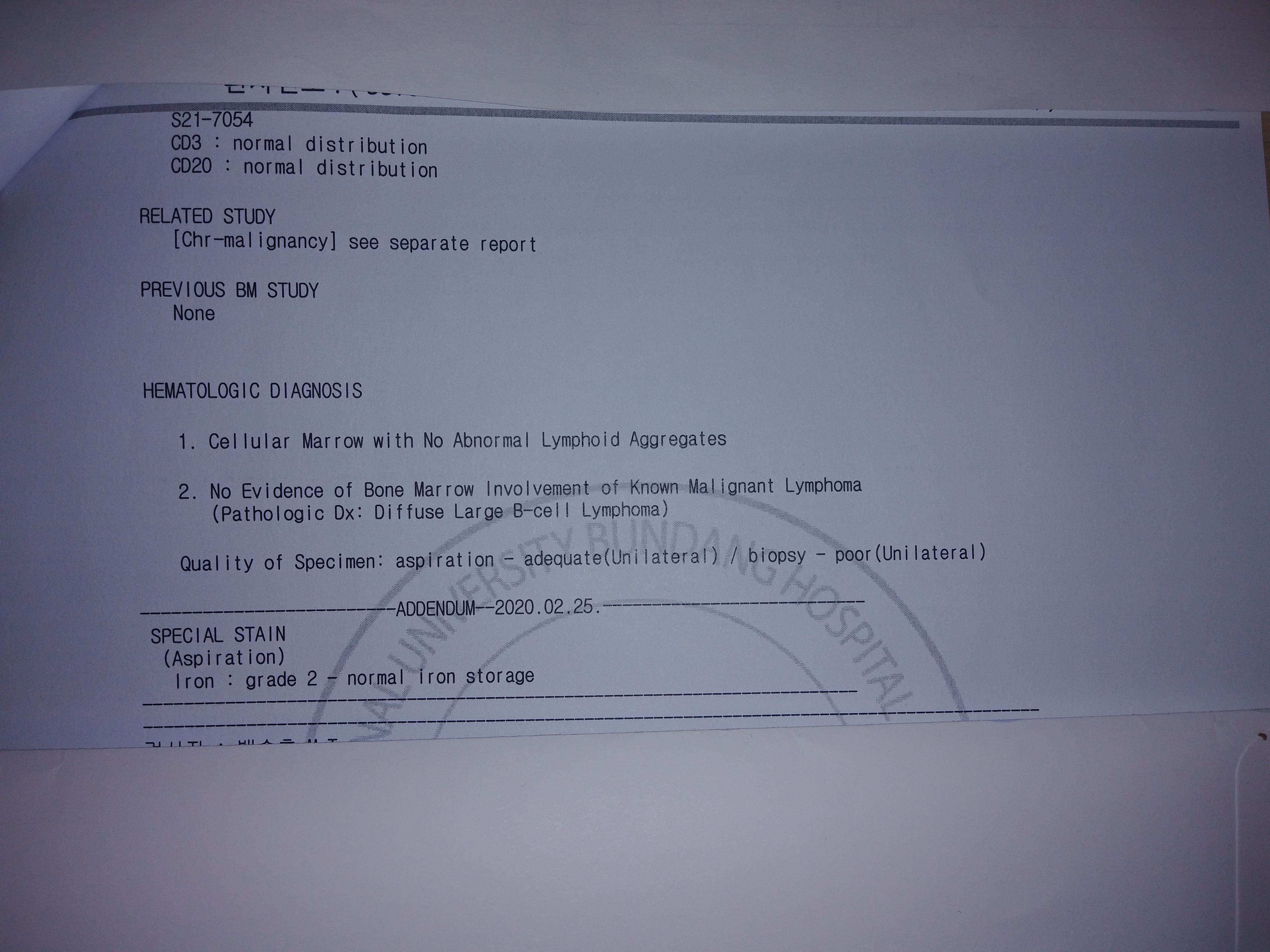 골수검사결과: 활동성 적골수에 비정상적인 림프구성 무리(응집) 발견 안됨. 골수침범 확인 안 됨. 골수흡인 시료상태: 적함 골수생검 시료상태: 양호하지 않음. 철저장 수치: 정상.