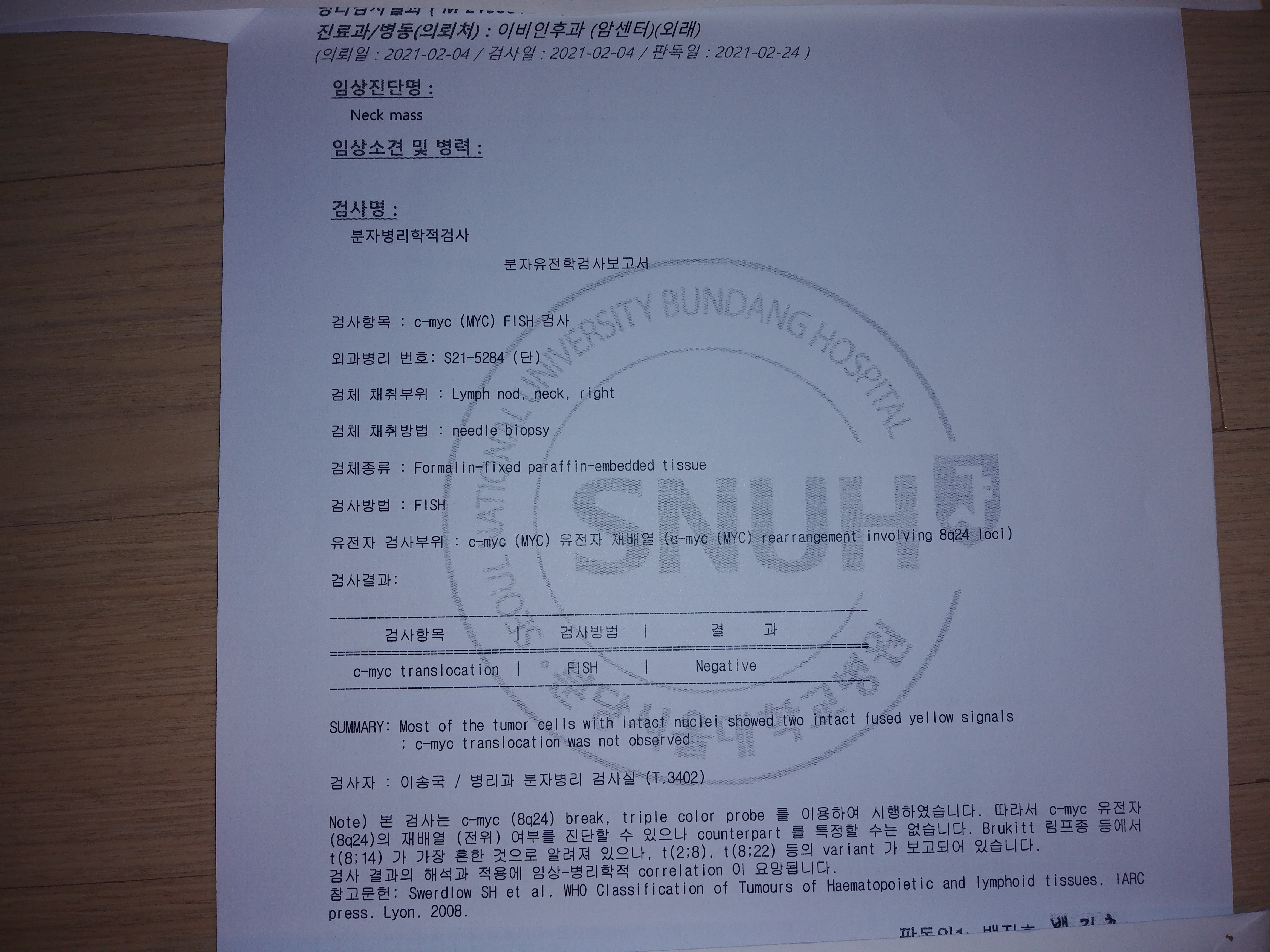 FISH 검사결과: C-MYC, BCL-2 유전좌 전좌 없음: 더블히트/트리플히트 배제함.