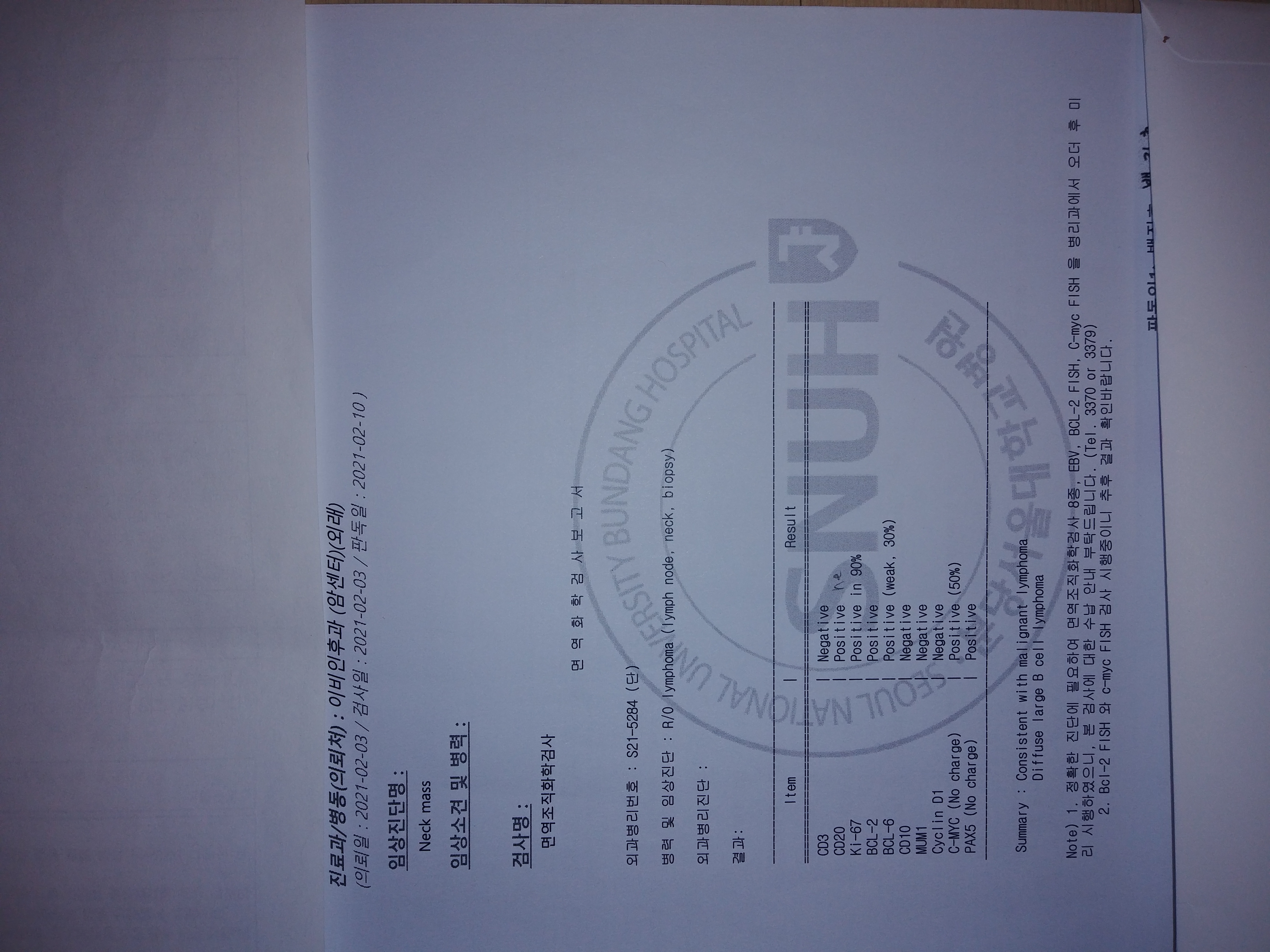 카페를 통해 많은 정보를 얻고 있습니다. 감사드립니다. 아내가 미만성 거대 b세포 림프종 진단을 받았는데...조직검사 결과지 해석과 어느부분이 중요한 내용인지 좀 알려주시면 정말 감사하겠습니다.