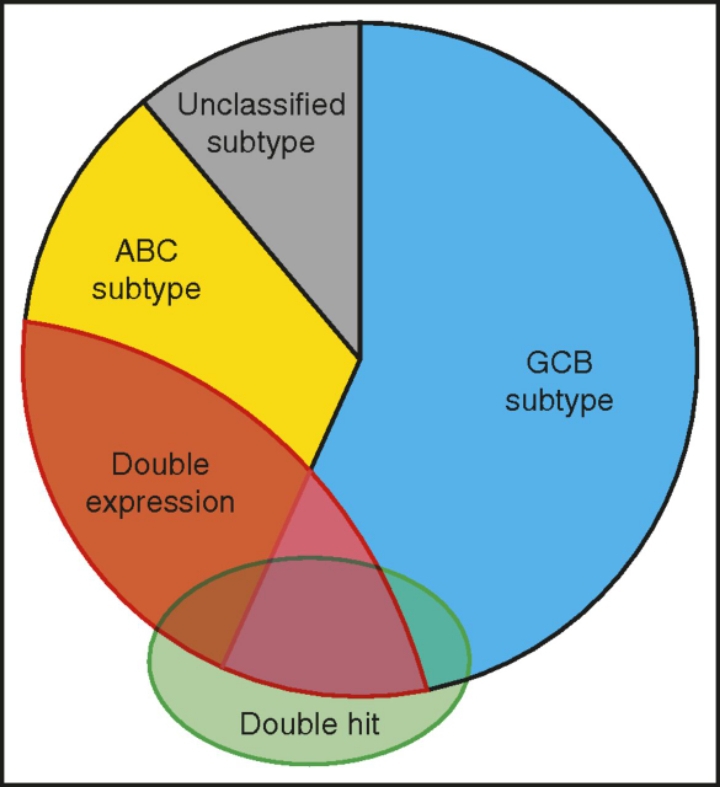 - 그외 면역조직화학염색 결과 bcl2+이고 c-myc+이면 더블 익스프레서(문헌에 따라 double expresser, double expression 또는 double expressor로 표기)라 합니다, 형광동소보합(fish) 검사 결과 c-myc와 bcl2 또는 c-myc와 bcl6에 전위(translocation)가 있으면 더블힛(double hit)이라 하고 c-myc, bcl2, bcl6 모두에 전위가 있으면 트리플힛(triple hit)이라 합니다. 상술한 아형들의 예후는 비교적 나쁩니다. 특히 더블힛/트리플힛은 who에서 "High-Grade B-Cell Lymphomas with Translocations of MYC and BCL2 and/or BCL6 (Double/Triple Hit Lymphoma)."로 림프종 분류를 새로 하였는데, nccn 가이드라인에 따르면 표준치료가 아직 확립되지 않았고 da-epoch-r, rhyper-cvad, r-codox-m/r-ivac 등 쎈 항암을 쓰고 있으며 그외 조혈모세포이식과 중추신경계 예방항암도 고려한다고 합니다.