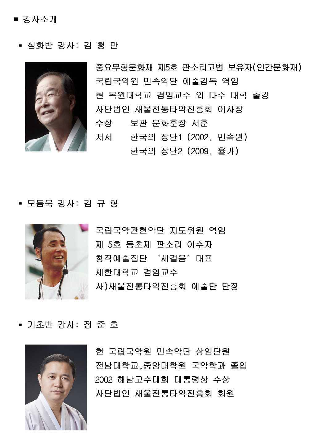 심화반: 장구장단과 고법(소리북)을 각각 월, 화요일 저녁 7시부터 2시간씩 배우며 총 2년 과정입니다(한 가지 과목만 선택도 가능합니다). 심화반은 예제곡을 실제로 반주하는 내용으로 수업합니다. 장구장단은 육자백이, 흥타령, 성주풀이 외 대표적인 민요 장단을 체계적으로 수업하며, 고법은 사철가 등의 단가와, 춘향가 등의 판소리 중에서 진양조, 중모리 등 판소리의 7가지 장단에 맞는 대목 소리 반주를 익힙니다.