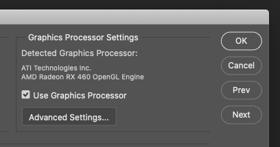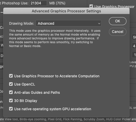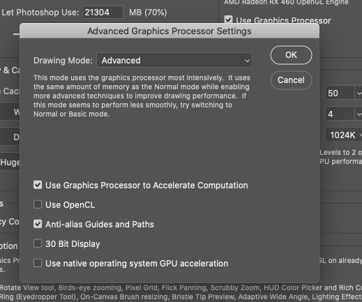 그래픽 프로세서의 기능을 포토샵이 직접 사용하도록 체크 된 상태에서 세부 세팅(Advanced Settings)항목의