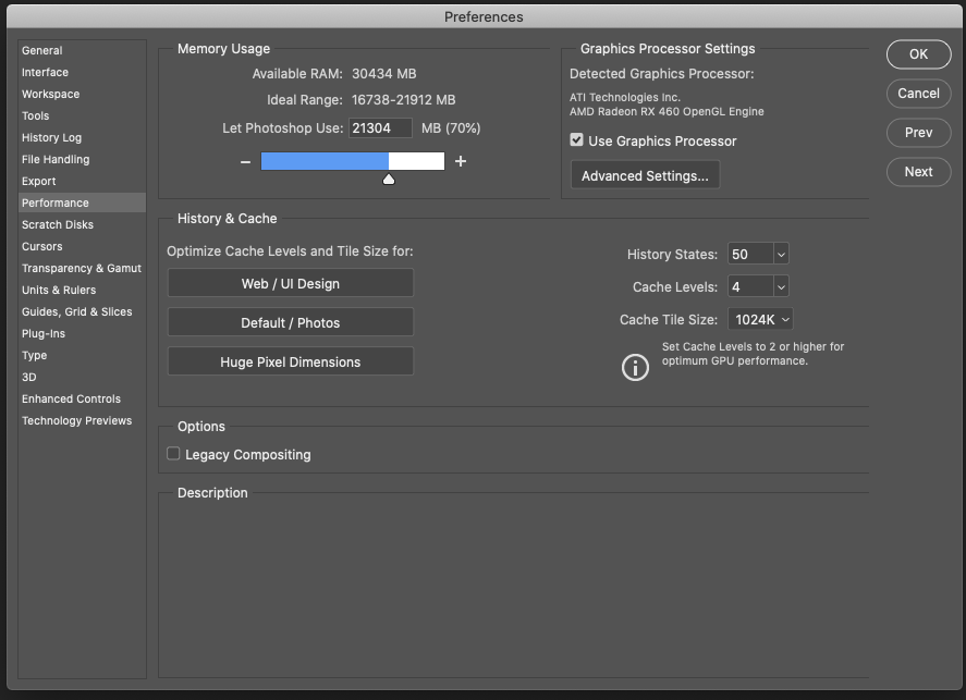 포토샵 설정의 성능 즉 Performance의 그래픽 프로세스 세팅부분에