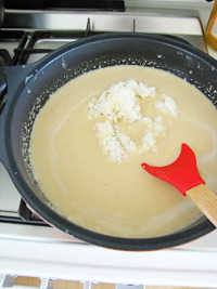 중간불에 콩물을 올려놓고.. 커피찻스푼으로 1스푼정도되는 소금을 넣은후... 밥(한공기 반~)을 넣어 계속 저으면서 뭉근하게 끓여줍니다...