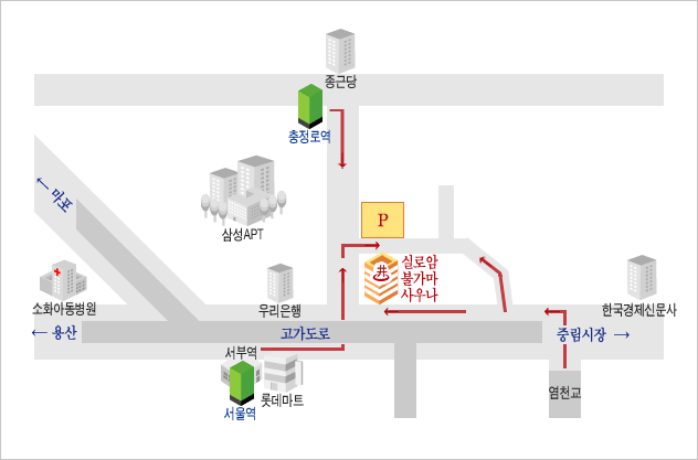 2호선, 5호선은 충정로역 ⑤번 출구에서 도보로 5분 거리 용산, 마포방향에서는 서부역을 지나 좌회전, ----------__----- -왼쪽으로 50M 지점.O. 지하철 노선 : 1호선, 4호선, 경의선은 서울역 ①번 출구에서 도보로 5분 거리 O. 택시,승용차 : 서울역부근에서는 염천교를 지나 좌회전 후, 삼성APT방향. O. 버 스 노 선 : 서부역(경의선광역전철) 앞 하차 초록버스 - 06, 0015, 0016, 7013, 7024 -파랑버스 - 104, 163, 261, 262, 503 O. 도 보 : 서부역(경의선광역전철), 롯데마트(서울역 뒤편)에서 한국경제신문사 방향으로 ----___________________--- -- -30M 지점에서 왼쪽으로. 명동, 남대문방향에서 오시는 분은 염천교를 지나