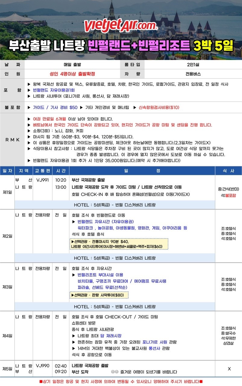 #부산출발 #나트랑 #빈펄휴양팩 #비엣젯 #첫취항 #취항특가 #빈펄랜드