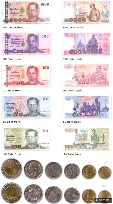 화페에 적혀있는것처럼 녹색 20바트부터 갈색의 1,000 바트가 있고,