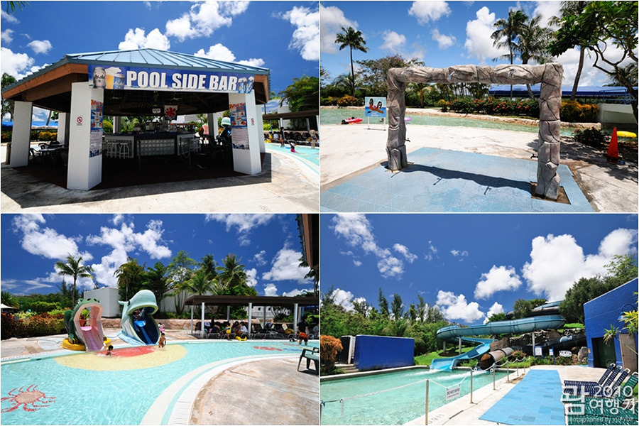풀사이드바 옆으로 유아풀(왼쪽 아래 사진)이 있어요 귀여운 개구리, 고래 모양의 미끄럼틀도 있구요