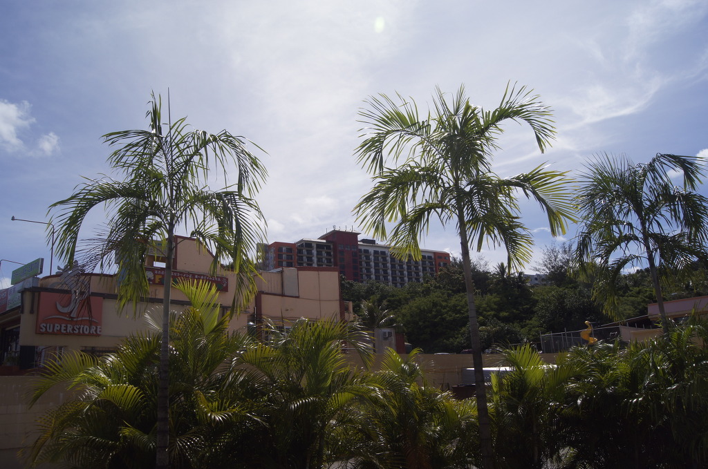 JP슈퍼스통어에서 본 오하나베이뷰호텔(오른쪽 위쪽), 밑에 야자수 따라가면 타자 워터파크가 나온다.