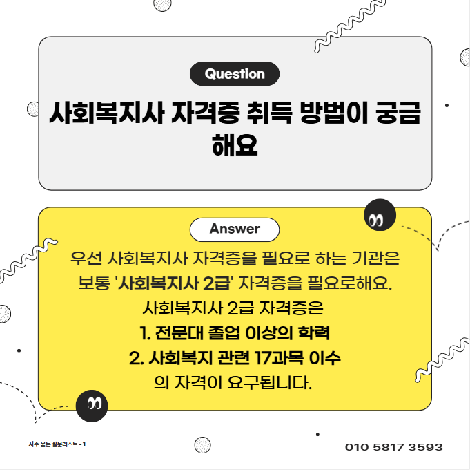 '전문대 졸업 이상의 학력' 과 '사회복지 관련 17과목 이수'가 가장 중요한데요.