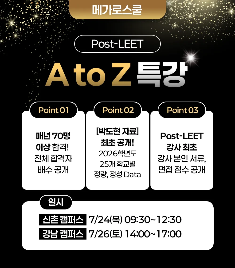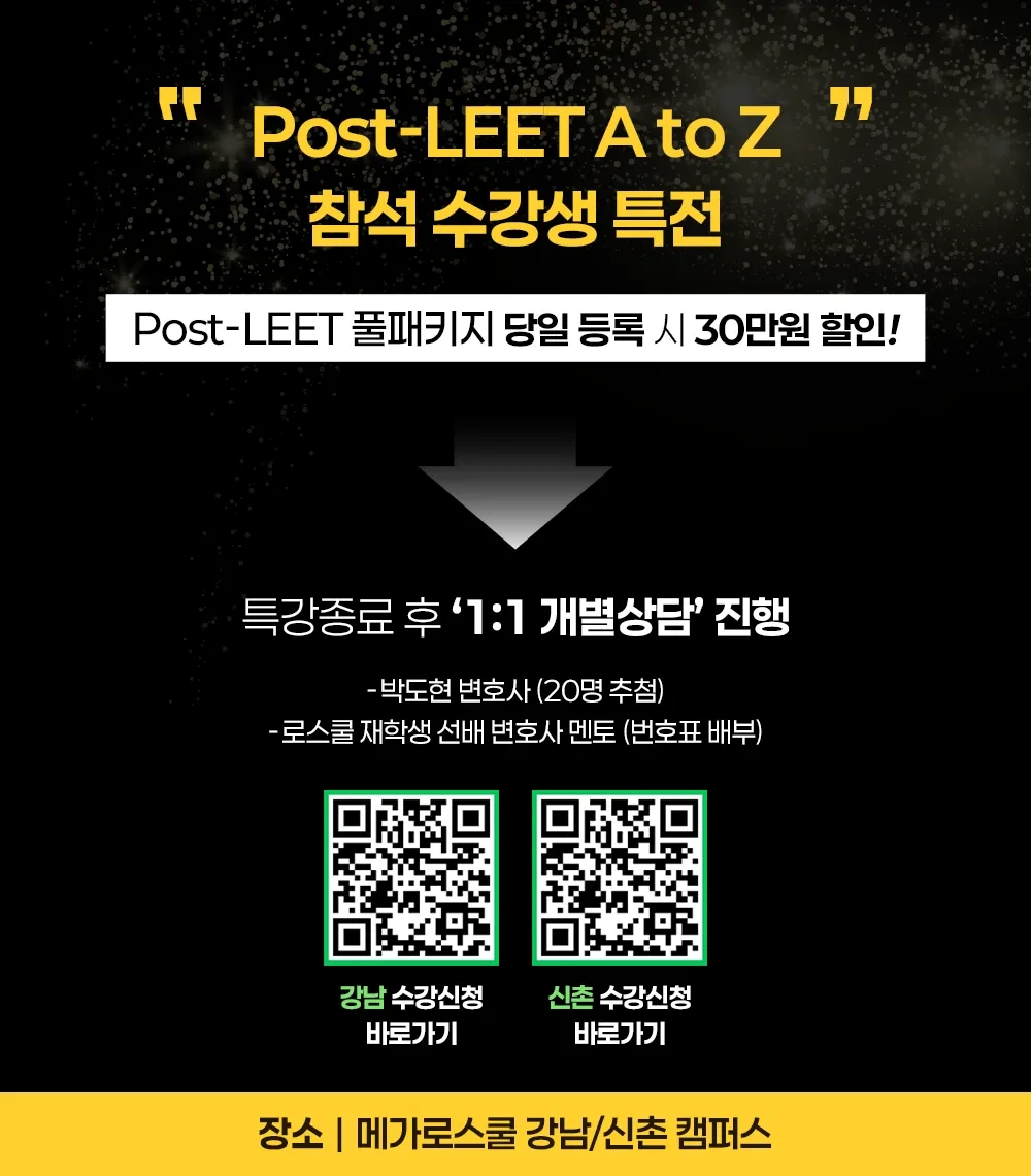 [무료특강] 2026학년도 대비 Post-LEET 가이드 특강 작성자박도현|작성시간25.07.20|조회수670 목록 댓글 0 글자크기 작게가 글자크기 크게가 [강남캠퍼스 수강신청] 바로가기 [신촌캠퍼스 수강신청] 바로가기 다음검색 현재 게시글 추가 기능 열기 북마크 공유하기 신고 센터로 신고 댓글 댓글 0 댓글쓰기 답글쓰기 댓글 리스트