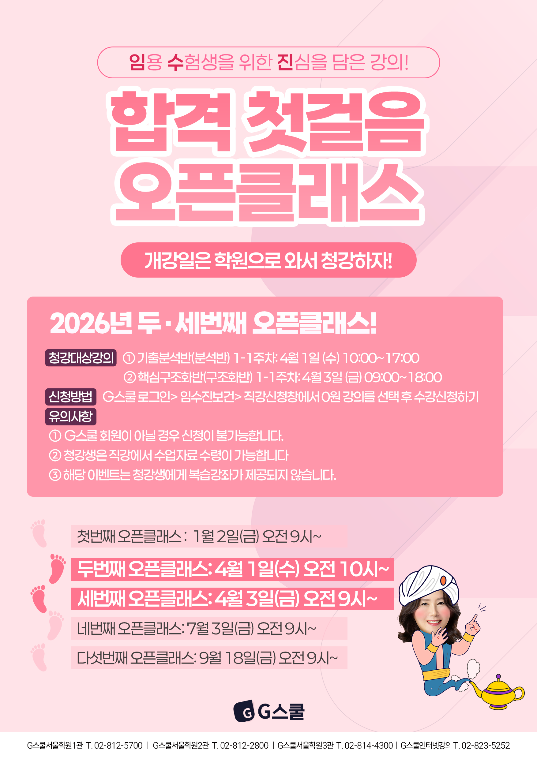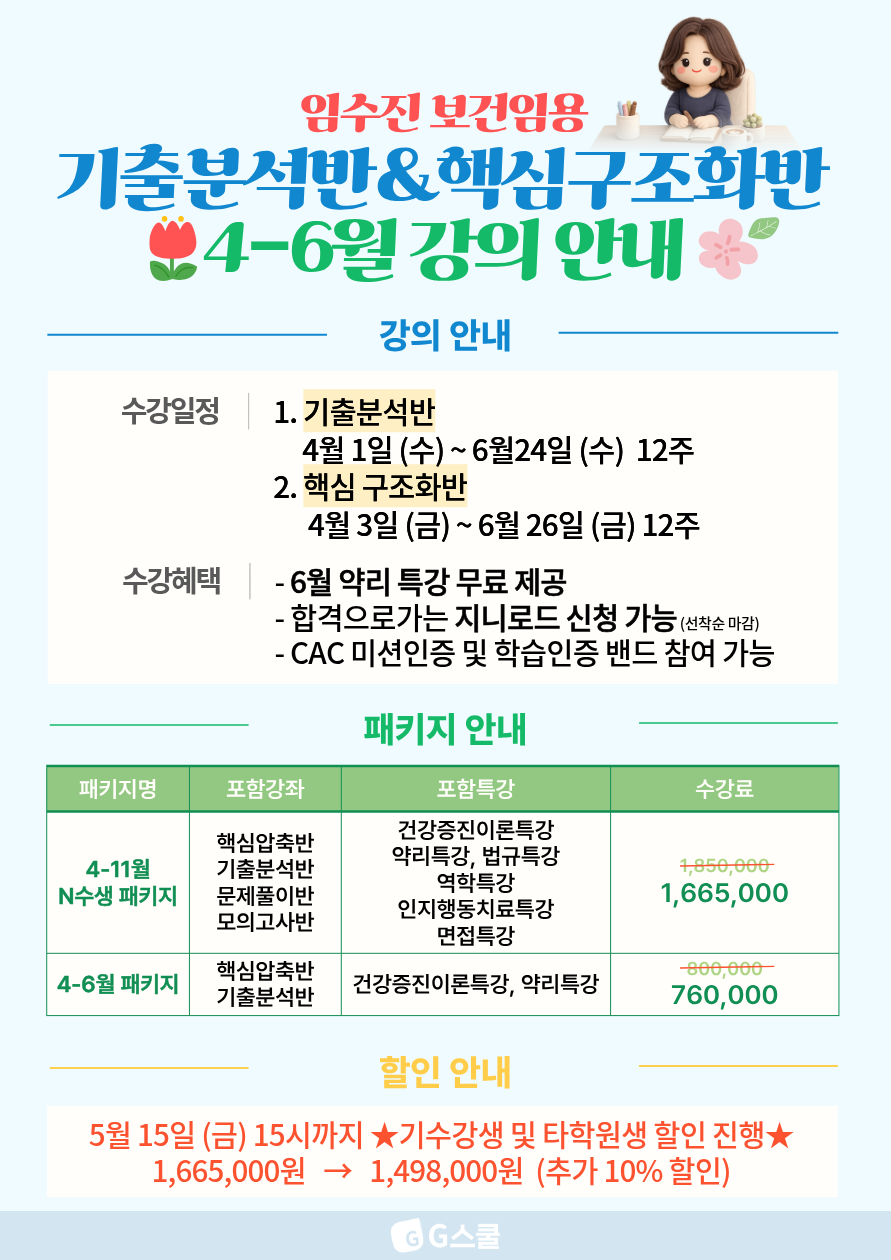 [임수진 보건] 4-6월 강의 무료 청강 EVENT l 4월 1일, 4월 3일 진행 작성자G스쿨|작성시간26.03.26|조회수129 목록 댓글 0 글자크기 작게가 글자크기 크게가 안녕하세요 G스쿨입니다.보건 임고생을 위한 진심을 담은 강의!임수진 보건임용 이제 다음주부터 시작되는 4-6월 강의!개강을 맞이하여 기출반, 구조화반의 직강을 무료 청강하실 수 있습니다~ 아직도 강의를 고민중이라면?청강을 들어보고 결정하세요! 다음검색 현재 게시글 추가 기능 열기 북마크 공유하기 신고 센터로 신고 댓글 댓글 0 댓글쓰기 답글쓰기 댓글 리스트