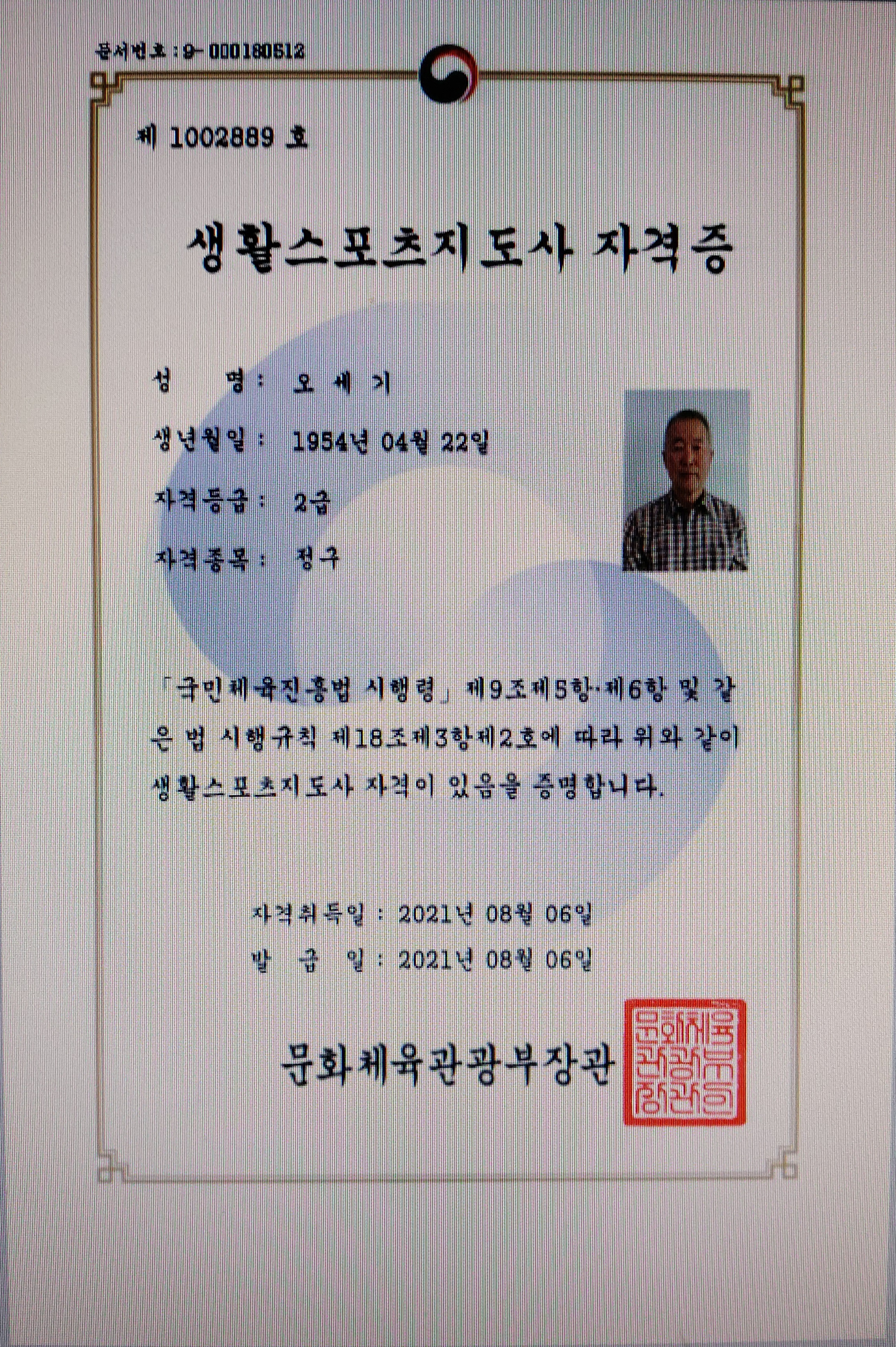 2020년 코로나로 전국대회도 없었는데 마침 경북도협회 주인식 전무님(대한소프트테니스협회 실무부회장)이 자격증 취득 안내를 해줘서 3월부터 교재2권을 사서 도전하였는데(스포츠교육학, 스포츠사회학, 한국체육사, 운동생리학, 스포츠윤리학, 스포츠심리학, 운동역학 7과목 중 5과목 선택, 과락40점 이하, 평균60점 이상) 저가 체육학 비전공이라 너무 어려워 포기 할려다가 코로나로 필기 시험이 7월4일로 연기되어 한번 해보자 맘먹고 PC와 씨름하여 대구 신명여중서 시험 보았는데 겨우 턱걸이 합격하고 또 코비드19로 실기 구술시험도 연기되어 2020.11.21(토) 충북 옥천서 시험보았는데 백스트록(본인은 테니스백이라서 보름동안 하루5시간 정구빽을 연습했는데~) 때문에 위험했는데 또 겨우 합격(실기와 구술 각70점이하 탈락)하고 마지막 단계인 연수는 2021년3월27일 경기대학교 연수원에서 비대면 줌으로 집에서 PC로 6일간 66시간 연수하고 봉화에서 초중등부 정구부 생체지도자에게 현장연수(4일간,24시간)도 받아서 오늘(2021년8월6일,금) 드디어 1년6개월만에 자격증 나왔어요!