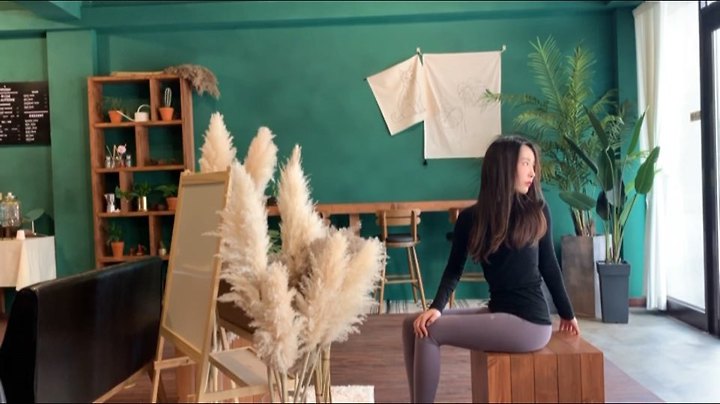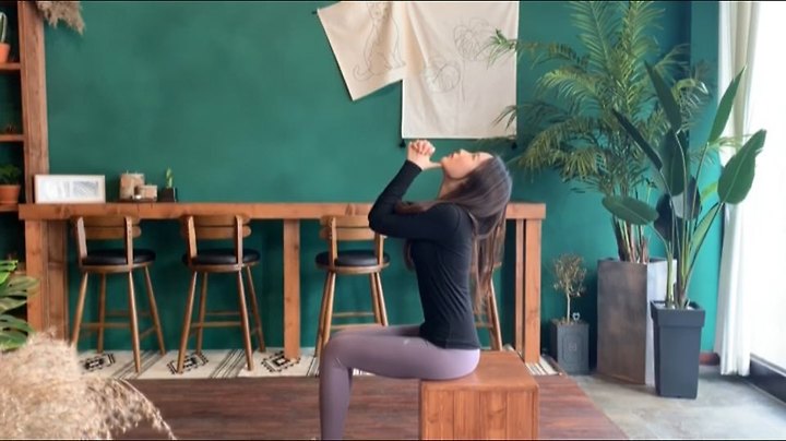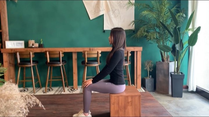STEP 9. 반대쪽도 같게 이어갑니다 내쉬는 숨에 왼쪽으로 회전시켜보세요. 오른손을 무릎을 왼손으론 멀리 의자를 짚어 트위스트 해주세요! 양쪽 3번씩 반복합니다