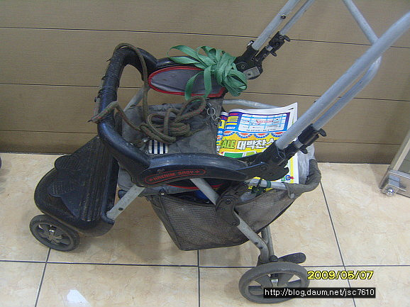 이 유모차는 70대 할머님이 주인인데 폐지며 홍보물,빈깡통등 보이는 데로 주워 실는