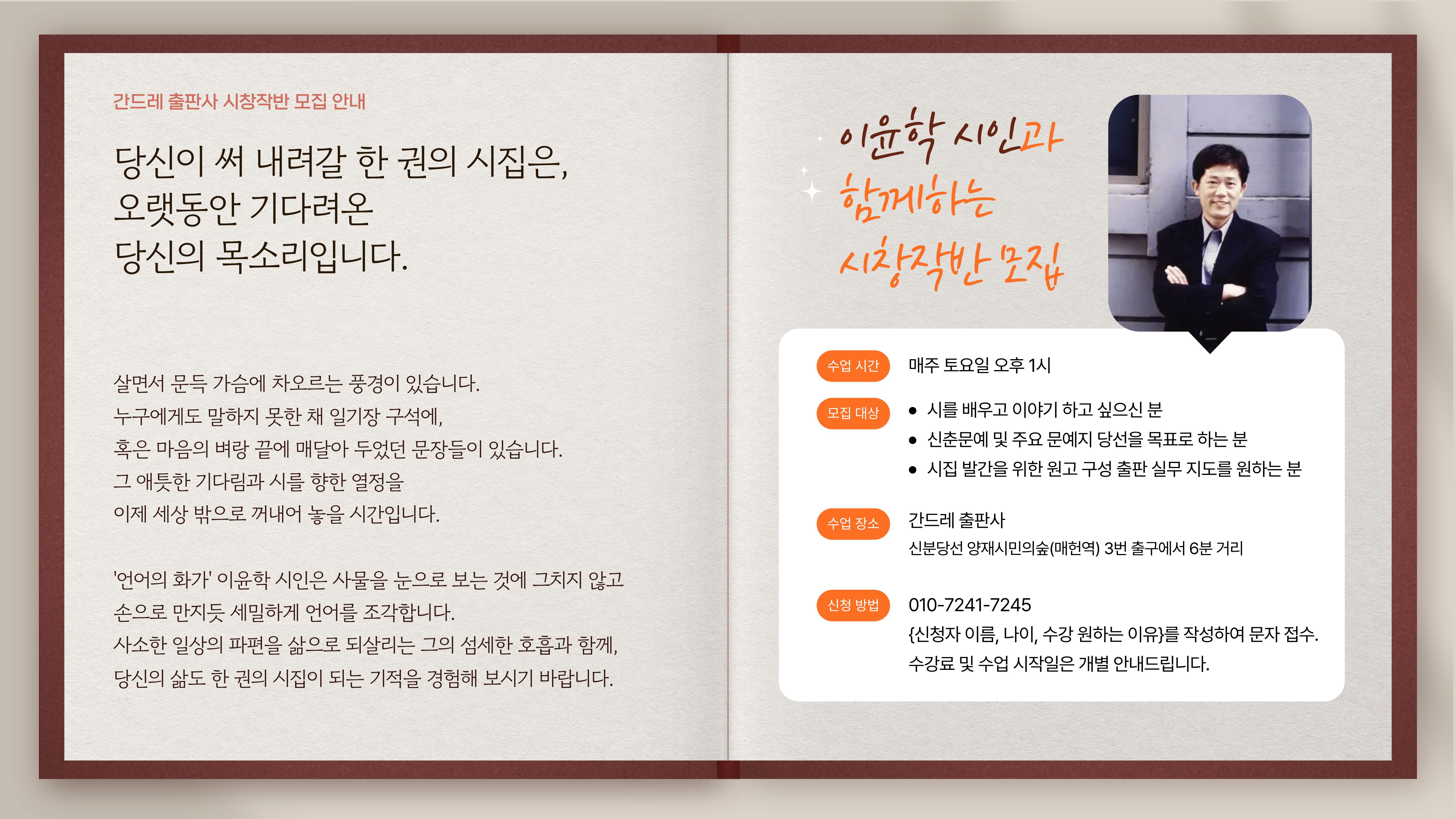 이윤학 시인과 함께 하는 시창작반 1분기 회원을 모집합니다.