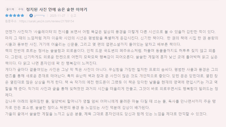 독자리뷰 <나를 챙기니 비로소 보고 느끼게 된 것들> 작성자달꽃|작성시간25.11.28|조회수10 목록 댓글 0 글자크기 작게가 글자크기 크게가 당신과 함께 있는 느낌 | 이윤학 | 오늘산책 - 예스24 당신과 함께 있는 느낌 | 이윤학 | 오늘산책 - 예스24“내가 반을 채웠으니 나머지 반은 당신이 채웠으면 좋겠다.”이윤학이 돌아왔다!언어의 화가 이윤학이 오랜 침묵 끝에 내놓은 첫 번째 사진 산문집. 시인 이윤학은 번잡한 도시의 소음과 요란www.yes24.com 다음검색 현재 게시글 추가 기능 열기 북마크 신고 센터로 신고 댓글 댓글 0 댓글쓰기 답글쓰기 댓글 리스트