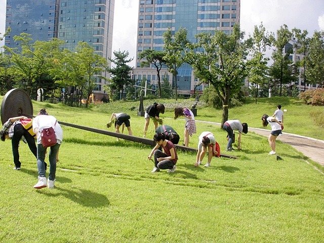 연약한(?) 여학생들은 잔디마당에 돋아 있는 잡초를 뽑기로 역할 분담을 했습니다.
