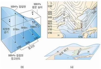 등압면의 고도가 나타난 상층의 일기도를 일반적인 지형도와 같게 읽은 후 산모양으로 나타나면 기압이 높은 것으로, 골짜기가 나타나면 기압이 낮은 것으로 해석할 수 있다.