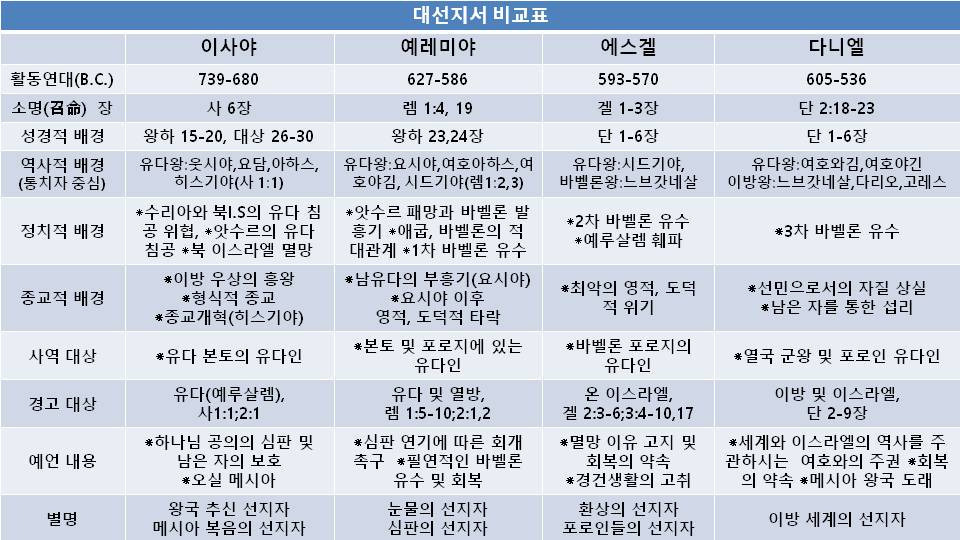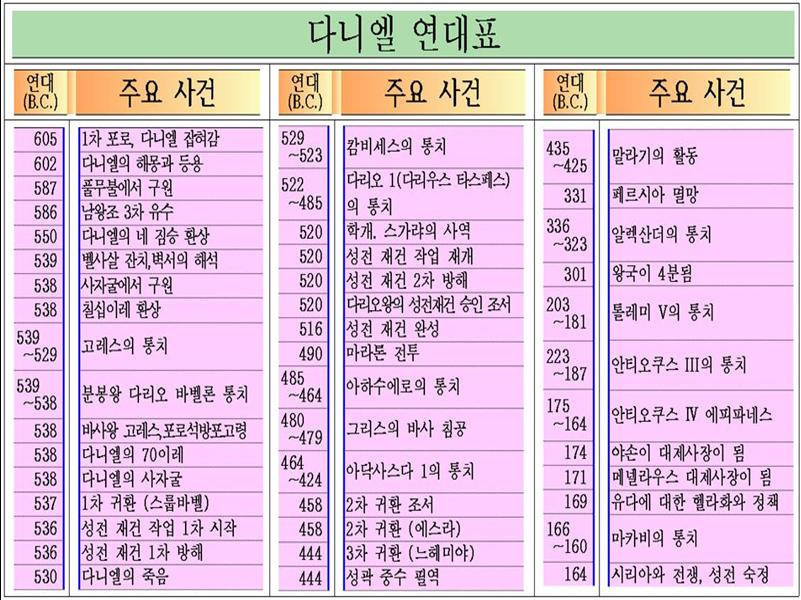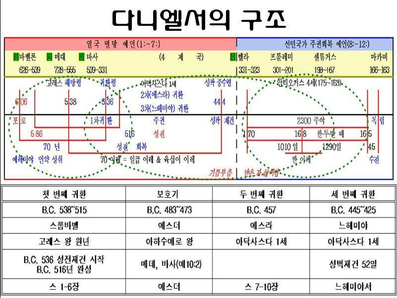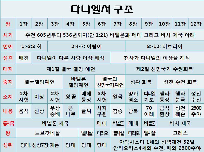 | 제1절 열국 멸망에 대한 예언 (1:∼7:) 1. 열국 멸망에 대한 예언 (1:∼3:) 1) 다니엘의 첫 번째 시험 (1:) (1) 선민의 유수 (1:1~2) (2) 다니엘과 친구들의 승리 (1:3~21) 2) 네 제국에 대한 이상 (2:1~23) (1) 느브갓네살의 꿈 (2:1~13) (2) 다니엘의 꿈 해석 (14~45) (3) 다니엘과 친구들의 등용 (46~49) 3) 다니엘의 두 번째 시험 (3:1) (1) 금신상 숭배 (3:1~7) (2) 다니엘과 친구들의 승리 (8~30) 2. 바벨론 제국 멸망 예언 (4:~5:) 1) 느브갓네살의 두 번째 꿈 (4:) (1) 땅의 중앙에 큰 나무 (4:1~18) (2) 다니엘의 꿈 해석 (19~33) (3) 느브갓네살 왕의 찬양 (34~37) 2) 메대 제국의 등장 (5:) (1) 벨사살 왕의 잔치 (5:1~12) (2) 다니엘의 글 해석 (13~28) (3) 메대 다리오의 즉위 (29~31) 3. 열국과 선민국가에 대한 예언 (6:~7:) 1) 다니엘의 세 번째 시험 (6:) (1) 다니엘에 대한 모함 (6:1~15) (2) 다니엘의 승리 (16~28) 2) 네 짐승에 대한 이상 (7:) (1) 네 짐승의 이상 (7:1~8) (2) 이상의 대한 해석 (9~28) | 제2절 주권 회복에 대한 예언 (8:~12:) 1. 선민국가의 성곽 회복 예언 (8:~9:) 1) 숫양과 숫염소의 이상 (8:) (1) 다니엘에게 나타난 이상 (8:1~14) (2) 가브리엘 천사의 해석 (8:15~27) 2) 다니엘의 기도와 칠십 이레 예언 (9:) (1) 예레미야의 예언 성취 기도 (9:1~19) (2) 칠십 이레에 대한 예언 (9:20~27) 2. 선민국가의 성전 회복 예언 (10:∼12:) 1) 바사의 멸망과 헬라의 등장 (10:) (1) 힛데겔 강가에서 본 이상 (10:1~9) (2) 천사가 헬라 출현을 알림 (10:10~21) 2) 헬라 제국의 분국과 전쟁 (11:) (1) 헬라 제국의 분국 (11:1~4) (2) 남방 왕과 북방 왕과의 전쟁 (5~19) (3) 비천한 사람의 즉위 (20~45) 3) 성전의 황폐와 수전 (12:) (1) 선민의 구원 예언 (12:1~4) (2) 성전의 황폐와 수전 예언 (5~13) 성경신학적 입장에서의 묵시문학이란, 주님께서 “아버지의 뜻이 하늘에서 이루어진 것같이 이 땅에서도 이루어지이다”라 가르치신 기도 내용과 같은 계시 방식이다(마6:10). 그러므로 하나님의 영원하신 뜻을 묵시(黙示)로 보여주시는 독특한 문학장르이다. 따라서 묵시문학이란 종말적(아직)이며 언약(이미)에 기초한 현재(지금)에 대한 교훈으로 해석된다. 이러한 이유로 다니엘서에서는 봉함하라 하였고(단12:4), 요한계시록에서는 인봉하지 말라 하셨다(계 22:10). 구약성경은 JX에대한 언약내용이기 때문에 JX의 초림으로 완성되었기 때문이다(요 5:39). 성령 강림 이후에는 성령이 교회에 하는 말에 귀를 기울여야 한다(계22:17). |
