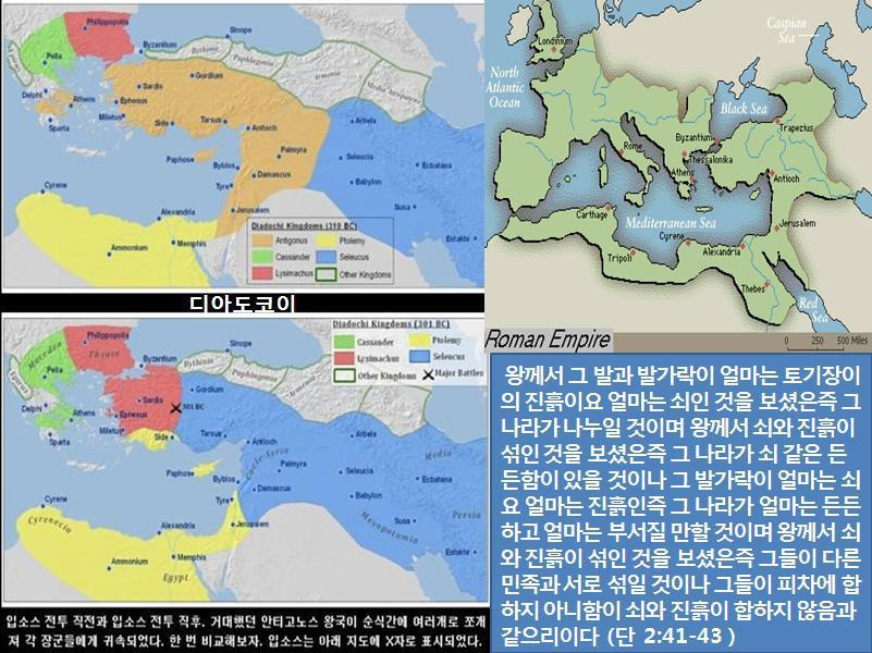 단8:20네가 본 바 두 뿔 가진 숫羊은 곧 메대와 바사 王들이요 단8:21털이 많은 숫염소는 곧 헬라 王이요 그의 두 눈 사이에 있는 큰 뿔은 곧 그 첫째 王이요 단8:22이 뿔이 꺾이고 그 代身에 네 뿔이 났은즉 그 나라 가운데에서 네 나라가 일어나되 그의 權勢만 못하리라 단8:23이 네 나라 마지막 때에 叛逆者들이 가득할 즈음에 한 王이 일어나리니 그 얼굴은 뻔뻔하며 속임수에 能하며 단8:24그 權勢가 强할 것이나 自己의 힘으로 말미암은 것이 아니며 그가 張次 놀랍게 破壞 行爲를 하고 自意로 行하여 亨通하며 强한 者들과 거룩한 百姓을 滅하리라 단8:25그가 꾀를 베풀어 제 손으로 속임수를 行하고 마음에 스스로 큰 체하며 또 平和로운 때에 많은 무리를 滅하며 또 스스로 서서 萬王의 王을 對敵할 것이나 그가 사람의 손으로 말미암지 아니하고 깨지리라