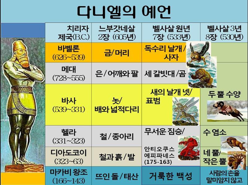 다니엘서에 표현된 이방 나라들의 미래 바벨론 : 단 2장 - 정금으로 된 머리(2:32) 단 7장 - 독수리 날개를 가진 사자(7:4) 바 사 : 단 2장 - 은으로 된 가슴과 팔(2:32) 단 7장 - 세 갈빗대를 문 곰(7:5) 단 8장 - 수양(8:3) 그리스 : 단 2장 - 놋으로 된 배와 넓적다리(2:32) 단 7장 - 네 날개와 네 머리를 가진 표범(7:6) 단 8장 - 숫염소(8:5) 로 마 : 단 2장 - 철로 된 종아리(2:33) 단 7장 - 철 이빨과 열 개의 뿔과 눈과 입이 있는 작은 뿔을 가진 짐승(7:7) 하나님의 나라 : 단 2장 - 뜨인 돌(2:34) 70이레의 예언(단 9:24-27) 70이레는 종말론적인 세계 역사를 의미하는 상징적인 숫자이다.