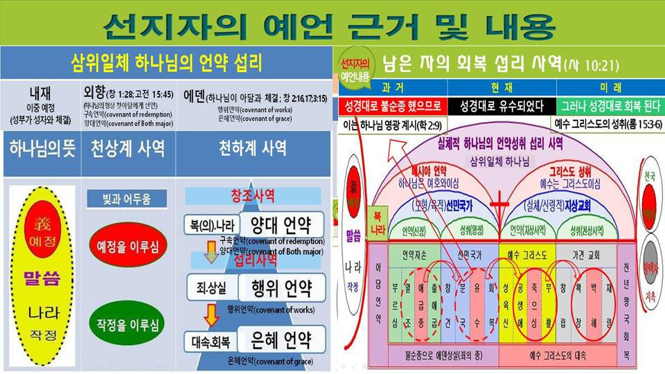 하나님께서 열조에게 ‘하나님의 나라’에 대한 언약성취 섭리 사역에 대한 선지자의 예언을 통해 메시야를 보내 ‘하나님의 나라’를 성취하실 것을 언약해 주시려고 열국 멸망에 대한 예언과 주권 회복에 대한 예언을 하게 하신다. 특별히 대선지서 가운데 예레미야서로부터 다니엘서까지의 역사적 배경은 남왕조가 유수될 때 예언한 내용이다. 이는 제사장 나라를 삼으시겠다는 언약을 이루시는 섭리를 밝히는 예언섭리가 분명하다. 그 가운데 통치 언약 부분으로써, 먼저 열국 멸망에 대한 예언을 보면 열국 멸망, 바벨론 제국 멸망, 열국은 멸하시고 선민국가는 회복하여 주실 것을 예언하게 하신다. 다음 주권 회복에 대한 예언을 보면 '하나님의 나라'인 선민국가의 성곽 회복에 대한 예언과 '하나님의 의'가 되시는 성전의 회복을 예언하게 하신다. 이는 아담에게 언약하신 '하나님의 나라'와 '하나님의 의'에 대한 예표로서의 실체적 섭리 사역이다. 그리고 이렇게 선민국가의 모형적인 역사는 계시로서 예수 그리스도에 대한 증거로 성취됐다. 선민국가의 모형적인 역사 섭리는 예수 그리스도를 통해 주님께서 세우신 교회를 세상의 제사장 나라로 삼으실 것에 예표로서의 예언 섭리이다. '하나님의 의'가 되시는 예수 그리스도는 만왕의 왕으로 오셔서 만물을 발아래 굴복케 하시고 '하나님의 나라'를 하나님께 바치신다.