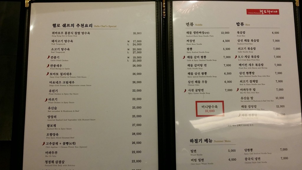 셰프 추천요리는 탕수육, 간풍기, 라조기 등 다양한 음식을 선보이고 있고, 면 종류, 볶음밥, 중국식 냉면, 냉짬뽕 등 탁이한 것도 있네요~ 전체적으로 경성대 맛집, 중국집 헬로 차이나 가격은 비싼 편인데, 맛도 좋고 양도 많아 가격이 아깝지 않네요^^ 미니 탕수육은 10,000원!!