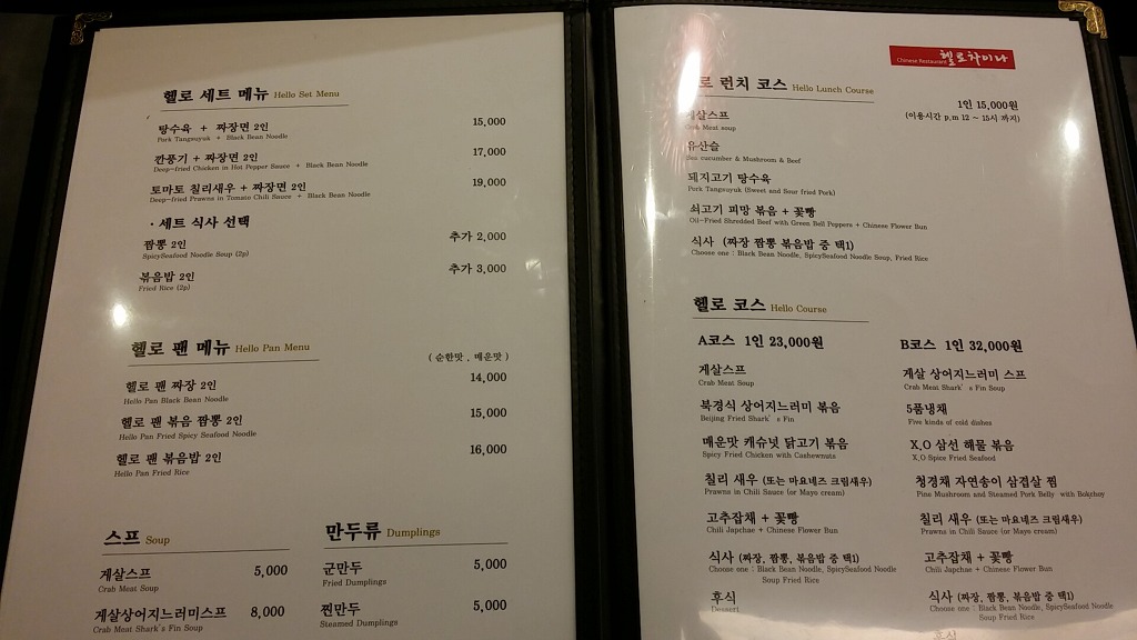 경성대 맛집, 중국집 헬로 차이나 메뉴들인데, 4페이지나 되는 분량이라 다 읽어보기 힘들 정도인데요~ 세트 메뉴가 있고, 세트 메뉴에 저렴한 가격으로 짬뽕, 볶음밥 추가도 가능해요~게살 스프도 있고, 코스 요리도 있답니다. 중국집에 코스 요리는 고급집에서만 볼 수 있는 현상이죠 ㅋㅋ 마치 뷔페에 온 것 같은 느낌이 들었습니다.